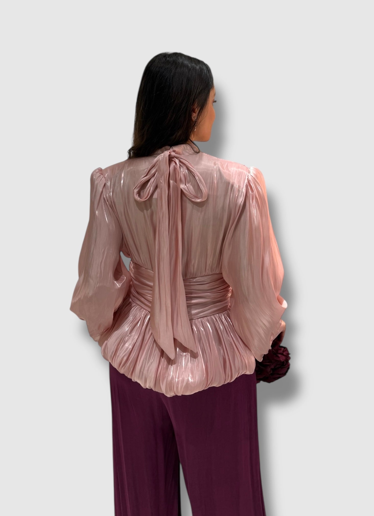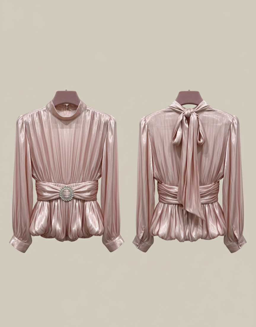 • Efecto Peplum: El cuerpo de la blusa tiene un diseño voluminoso en la parte inferior, creando una silueta tipo "globo" que aporta movimiento y estructura.