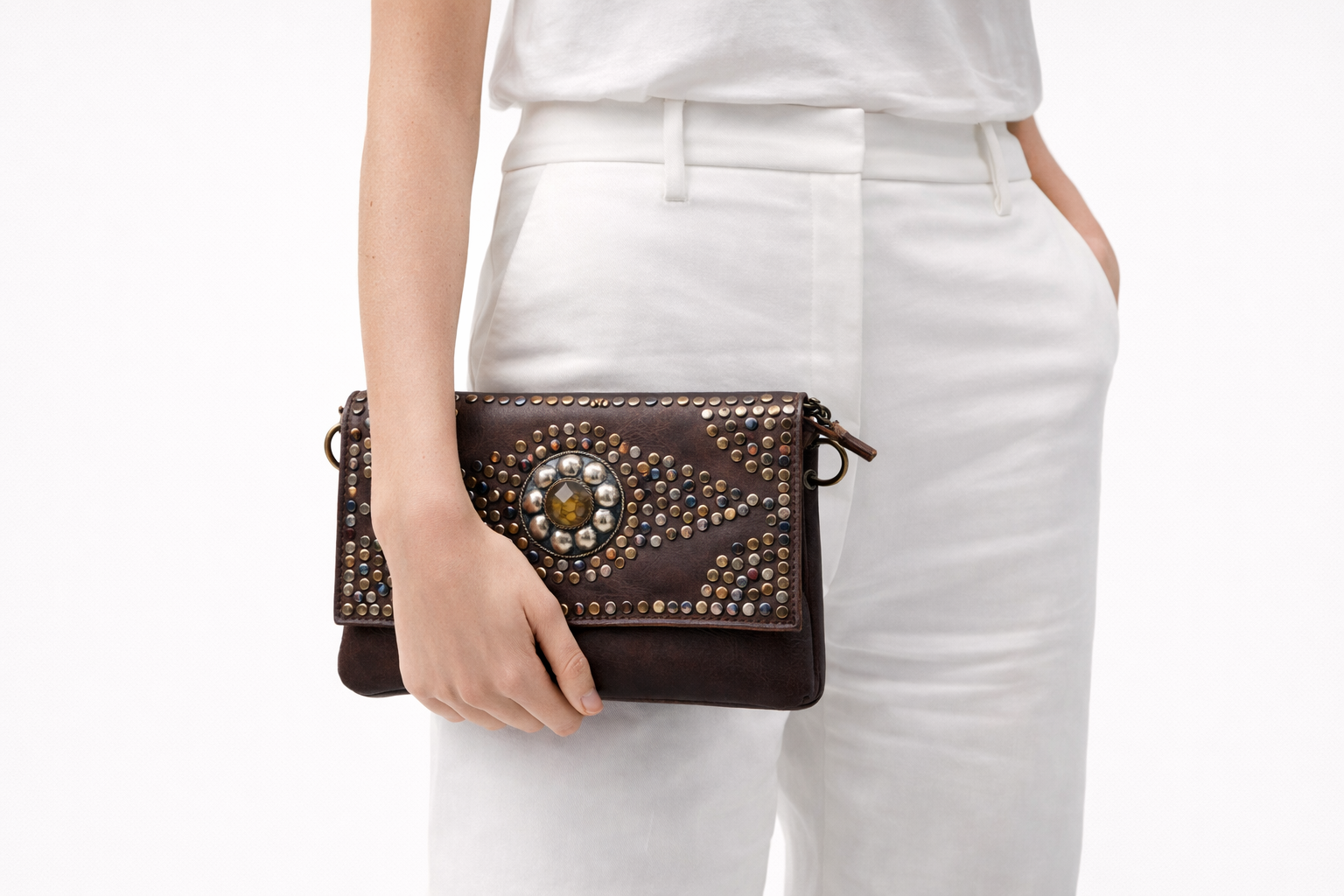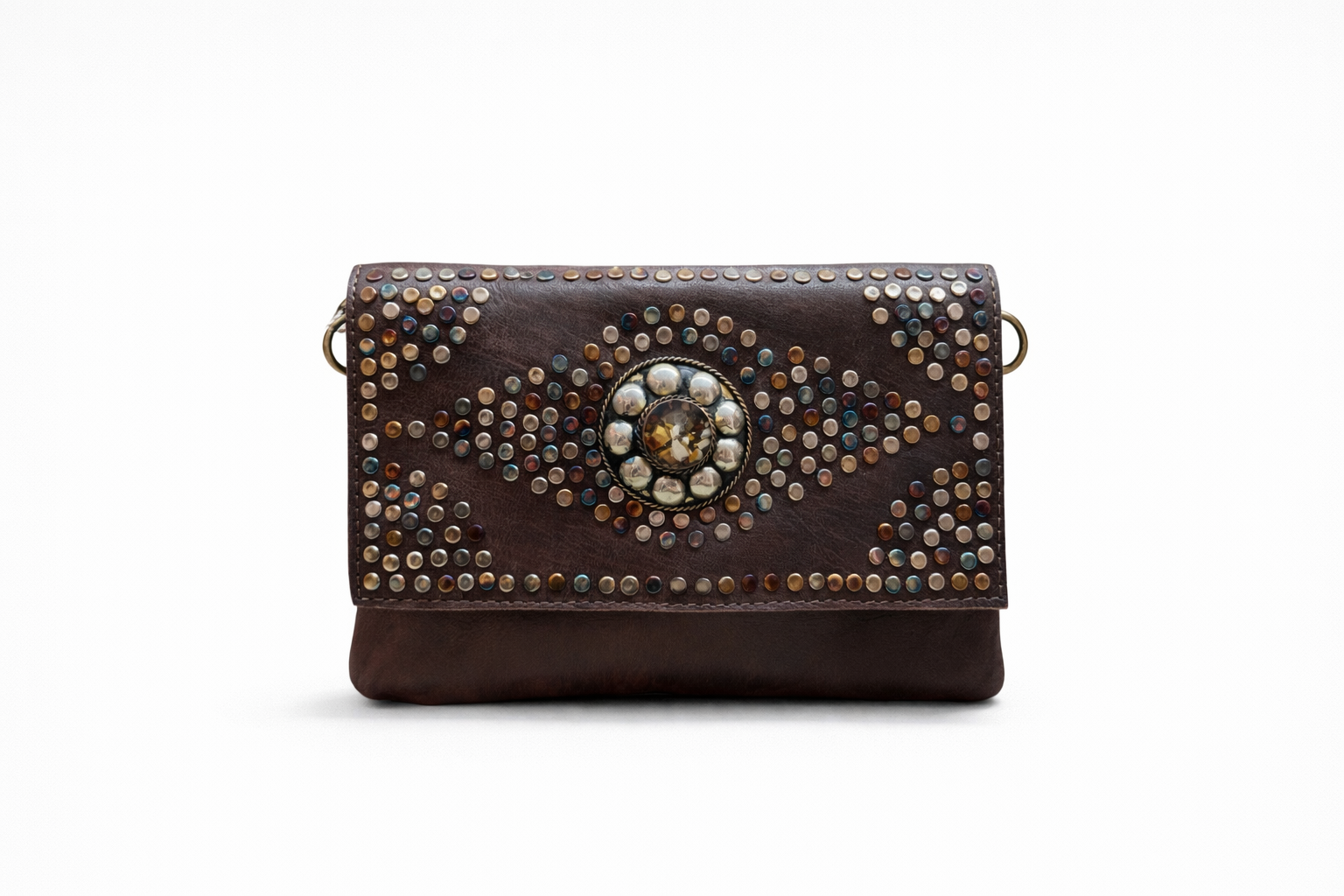 Bolso de piel auténtica con diseño artesanal y carácter único. Decorado con tachuelas metálicas en diferentes tonos y un elegante detalle central efecto joya, este modelo combina estilo boho y sofisticación en una pieza atemporal.
