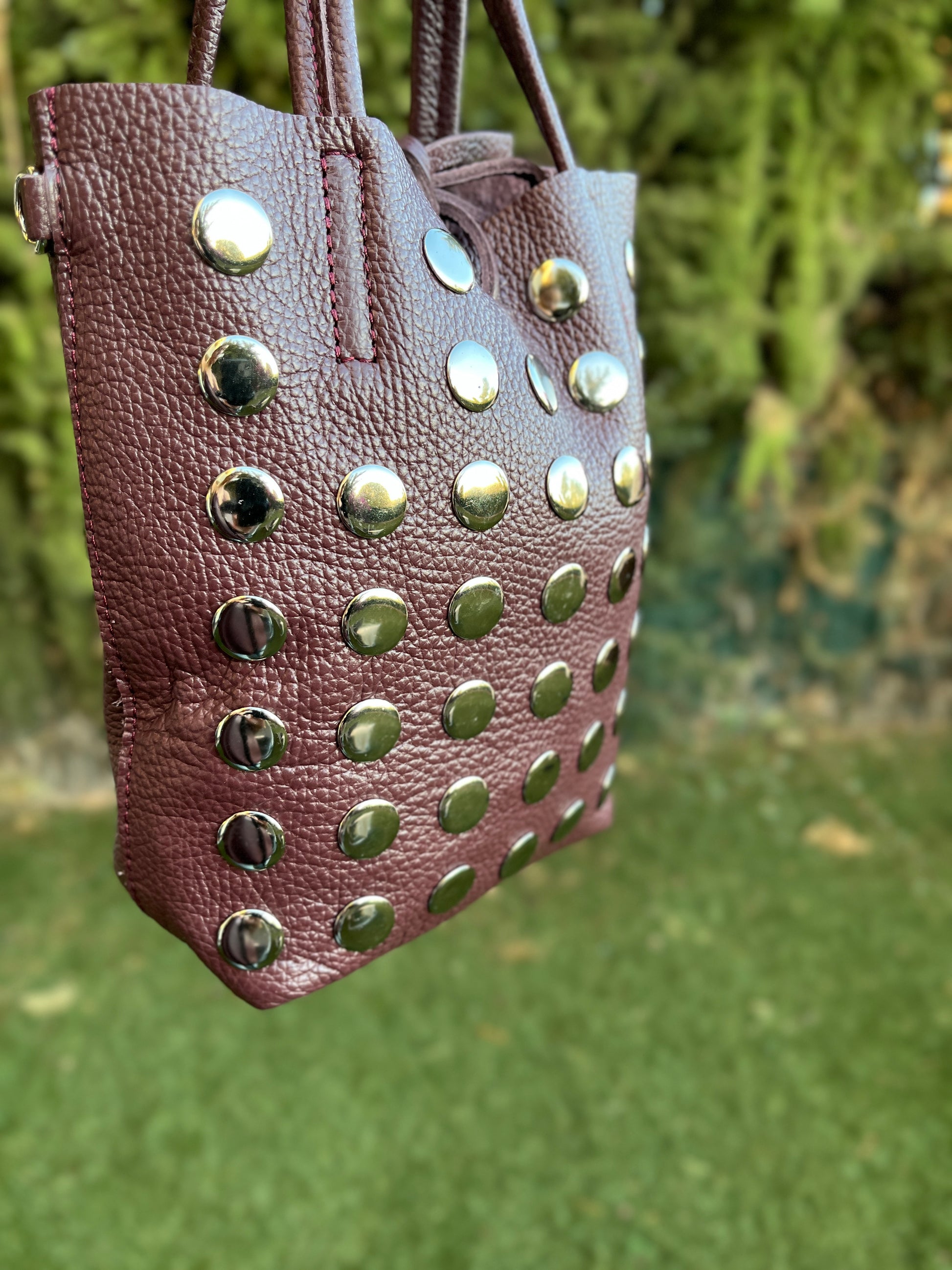 Un accesorio con carácter y estilo. Nuestro bolso de piel con tachuelas metálicas combina el diseño urbano con un toque sofisticado. Su textura suave y sus detalles plateados lo convierten en el complemento perfecto para elevar cualquier look.