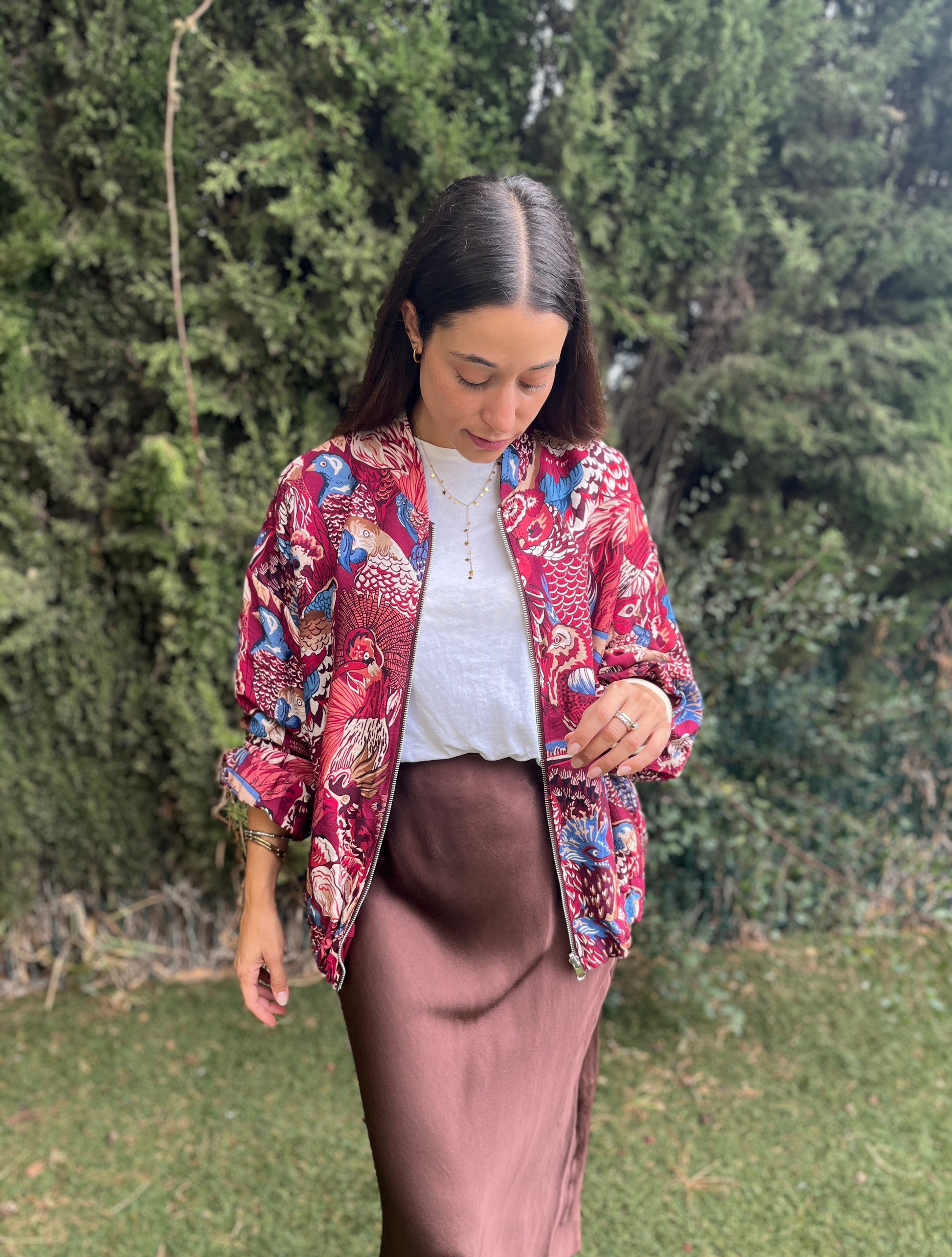 Una prenda, dos estilos. Esta bomber reversible es perfecta para quienes aman cambiar de look sin complicaciones. Por un lado, luce un diseño burdeos liso, elegante y fácil de combinar. Por el otro, sorprende con un estampado vibrante de loros multicolor, ideal para dar un toque divertido y original a cualquier outfit.