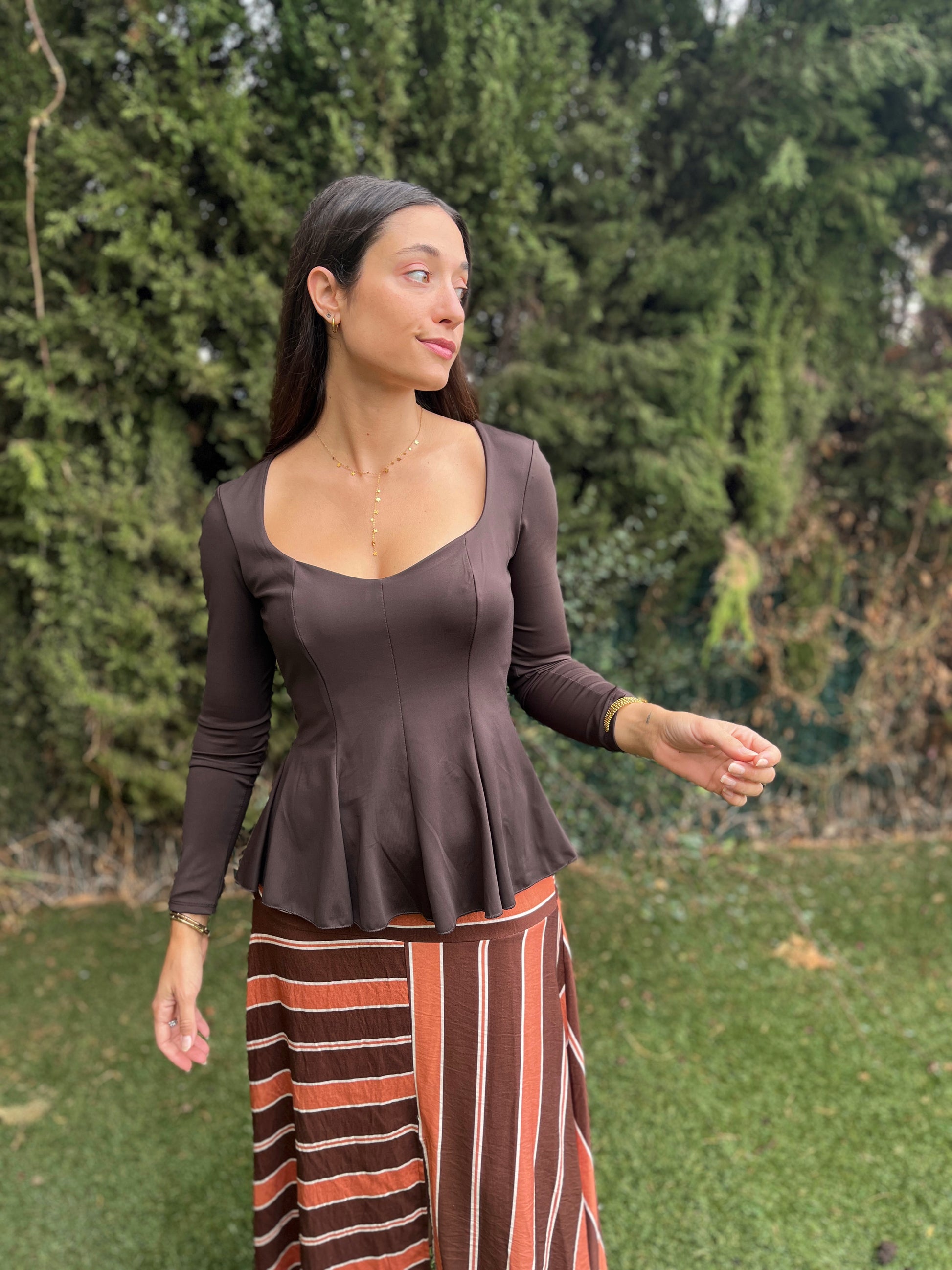Con un escote cuadrado que realza el cuello y un corte entallado con vuelo en la cintura, estiliza la figura de manera natural. Las mangas largas y la caída fluida en el bajo le dan un toque sofisticado, ideal tanto para looks de día como de noche.