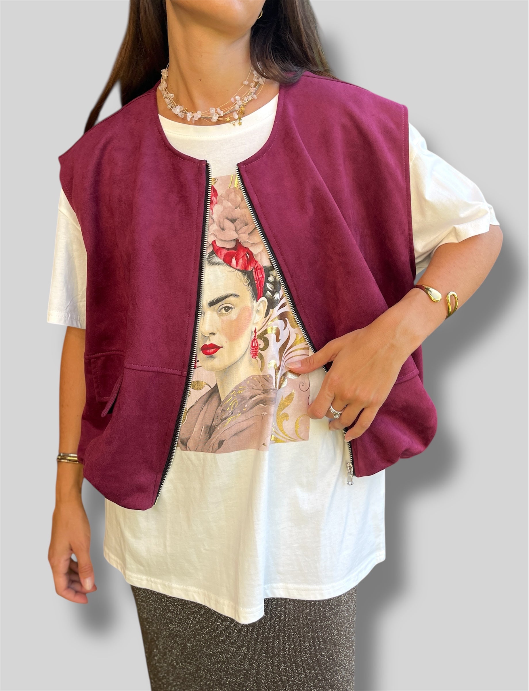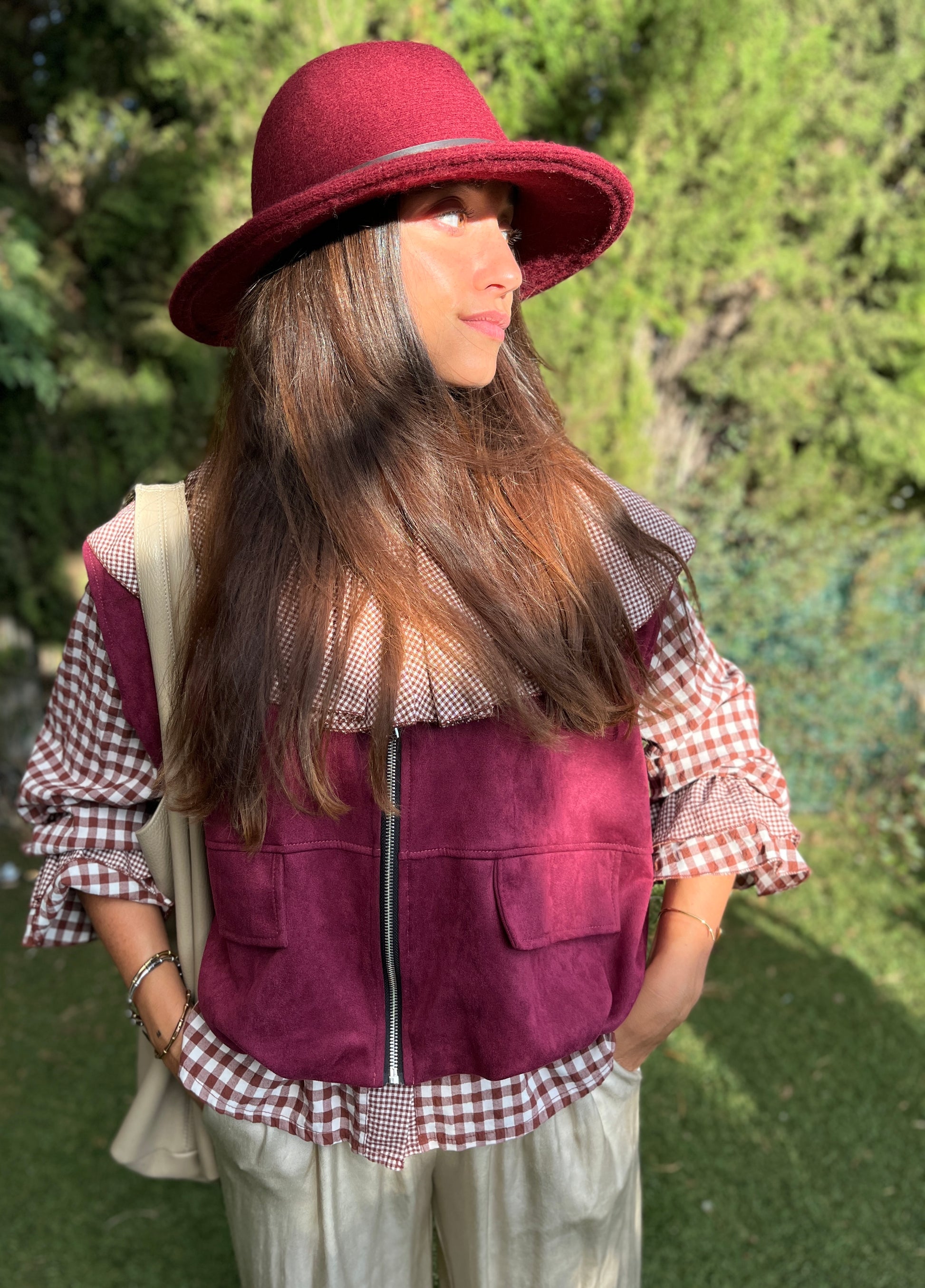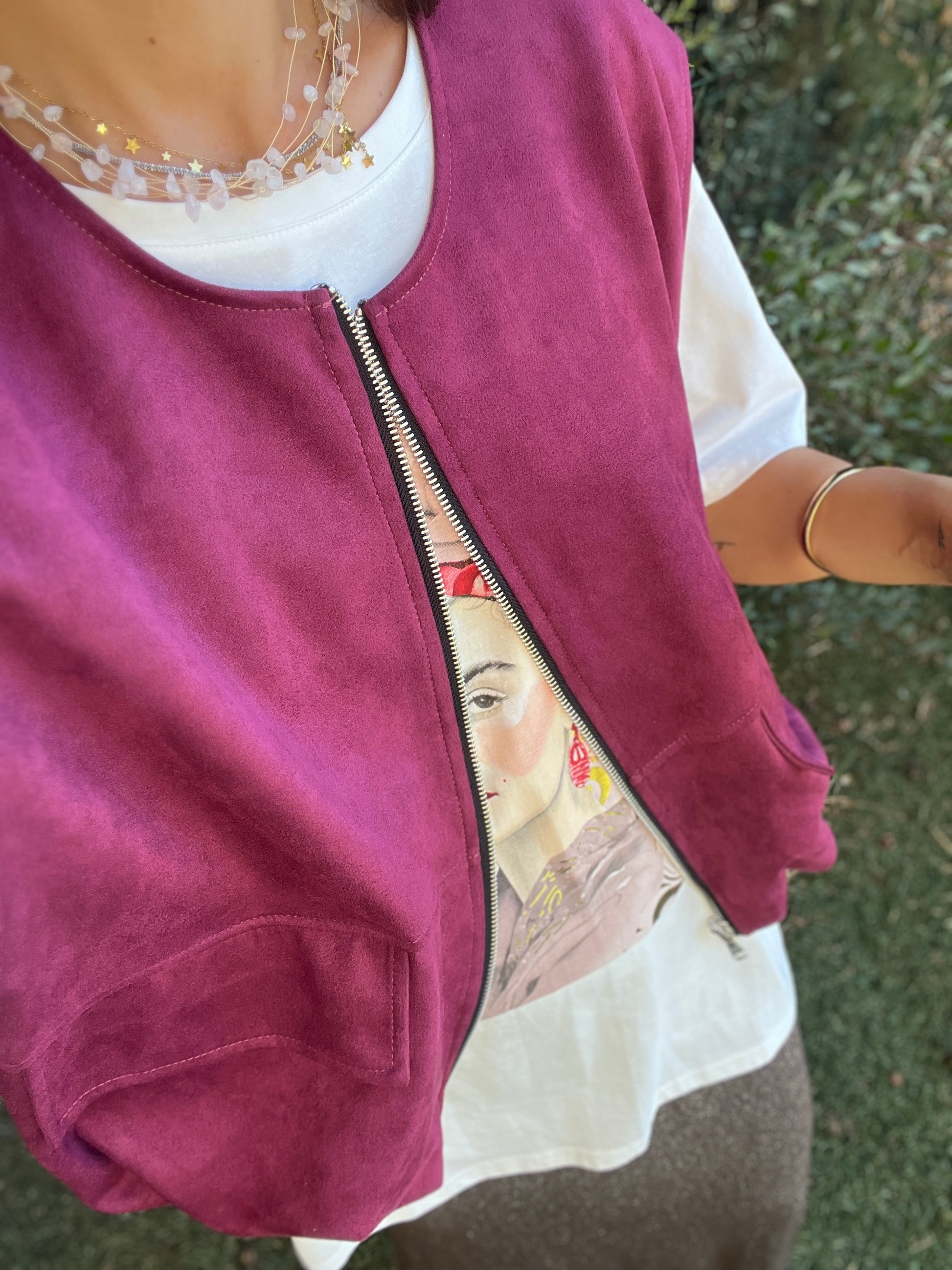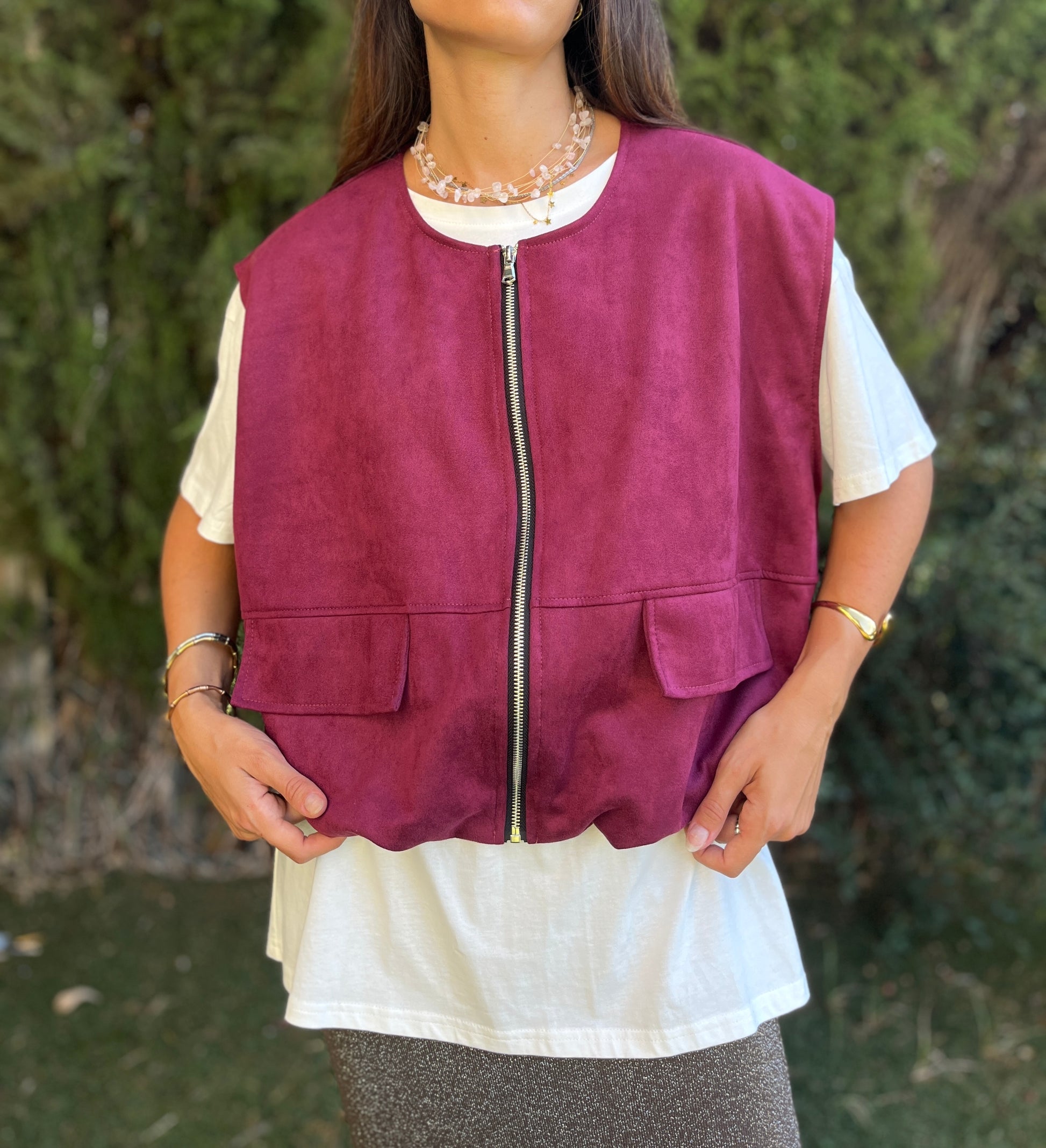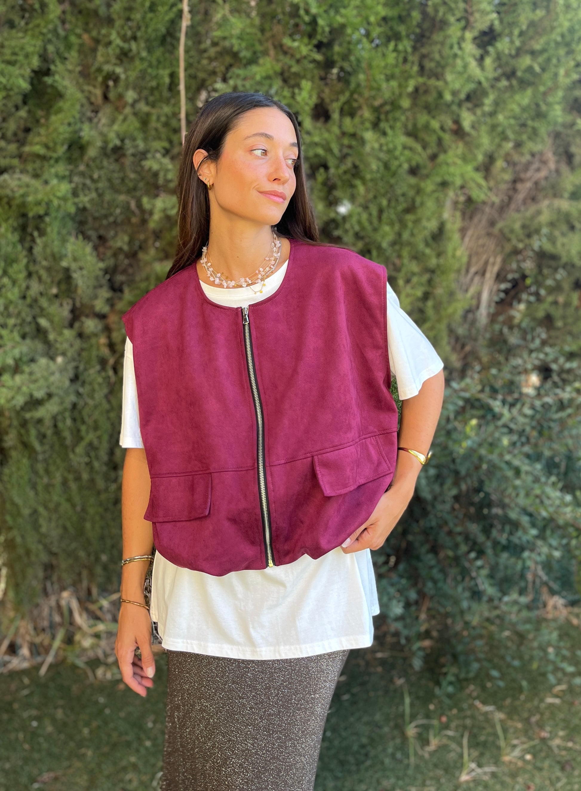 Dale un toque sofisticado y versátil a tus looks con este chaleco de ante en tono burdeos. Su diseño sin mangas y con cremallera frontal lo convierten en una prenda fácil de combinar tanto con camisetas básicas como con camisas o vestidos.