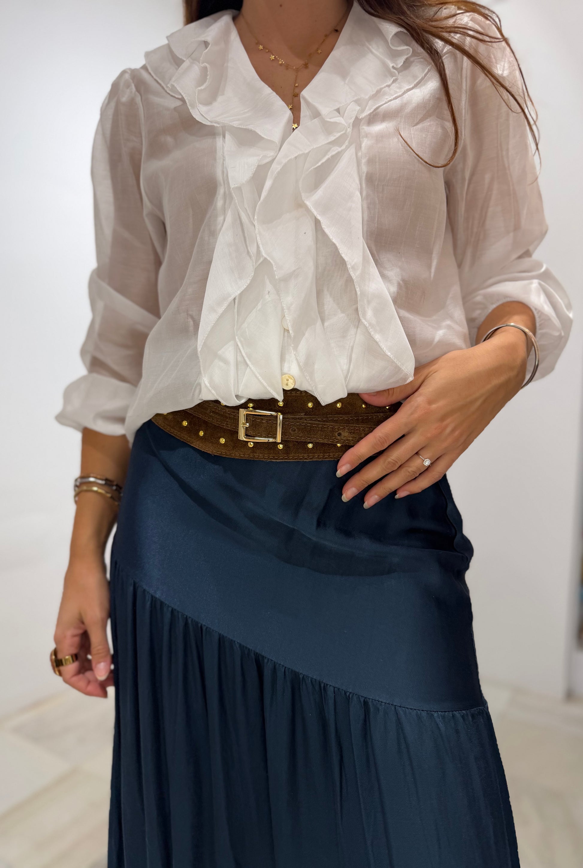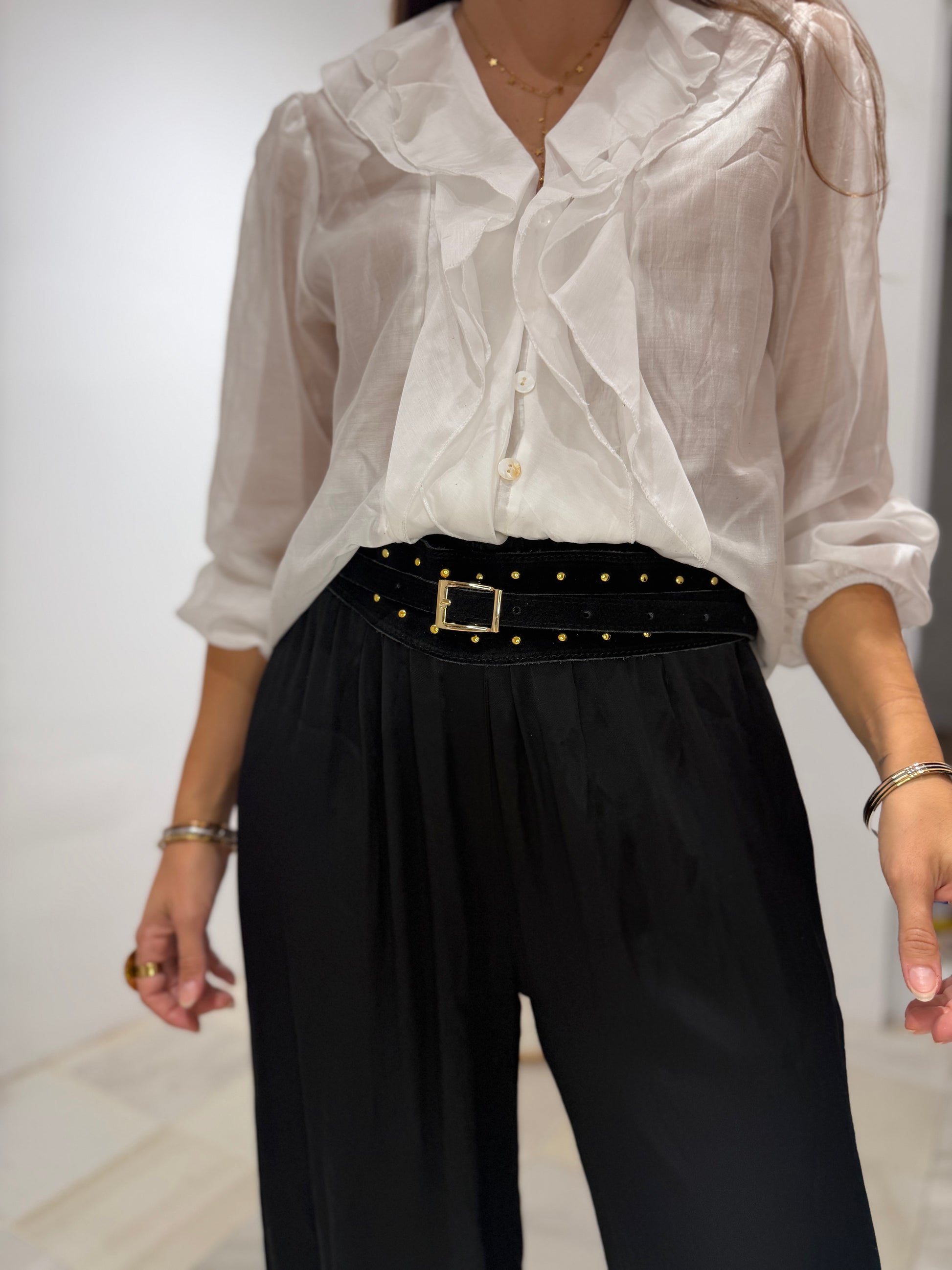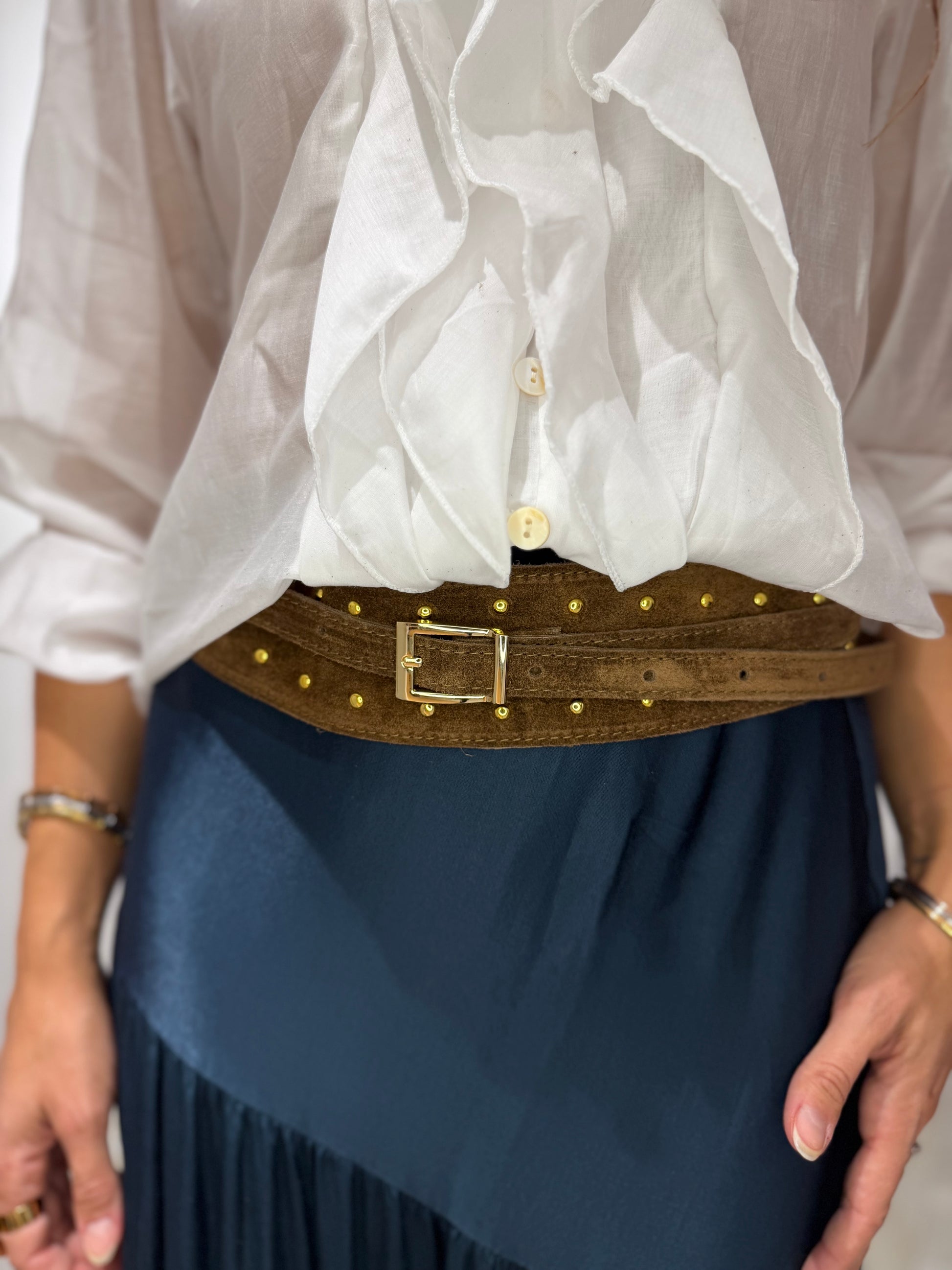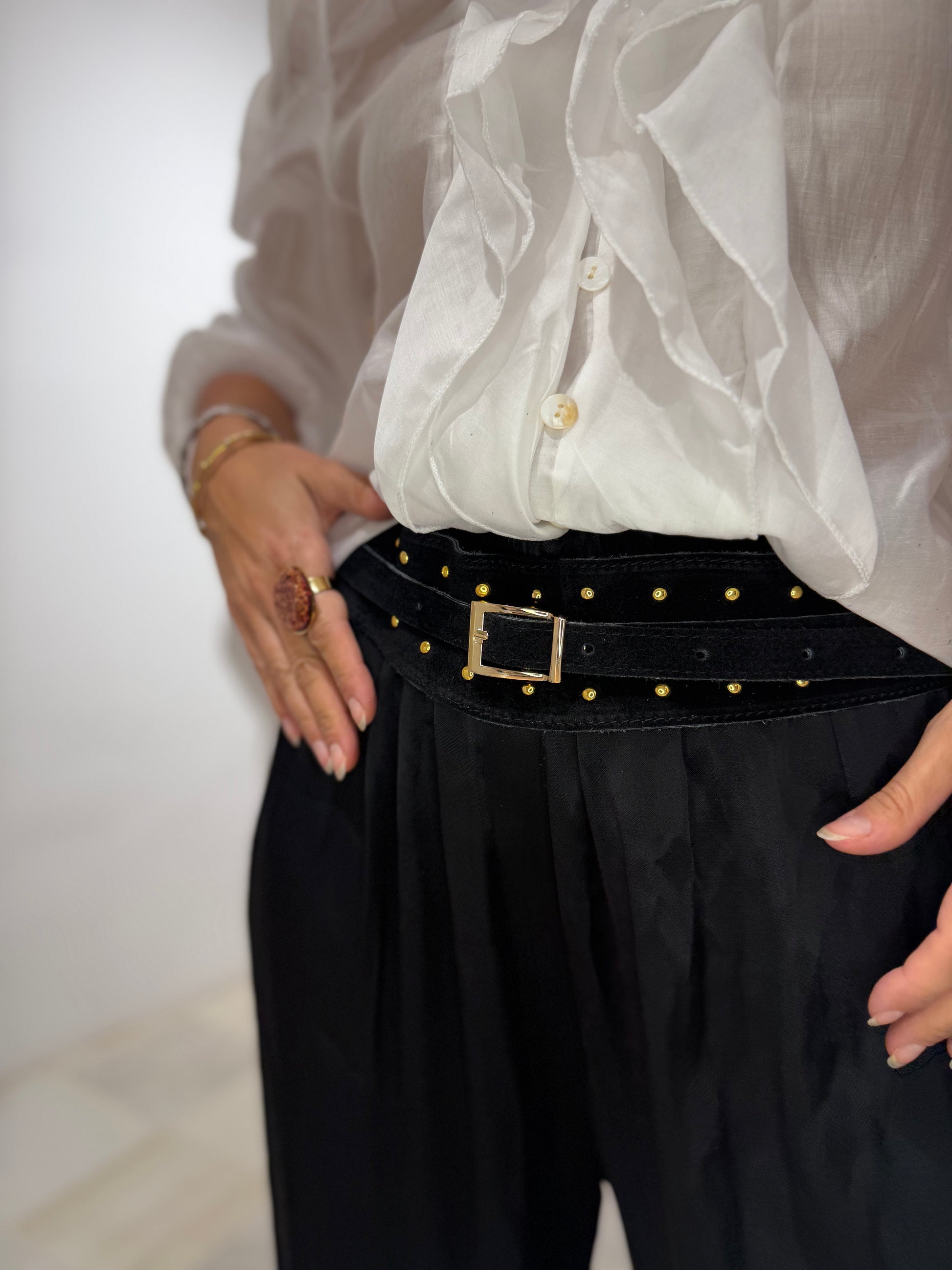 Añade estilo y estructura a tus looks con este cinturón ancho confeccionado en serraje suave de alta calidad. Su diseño destaca por las tachuelas doradas distribuidas de forma elegante y una hebilla metálica dorada, que aportan un toque sofisticado y muy actual.
