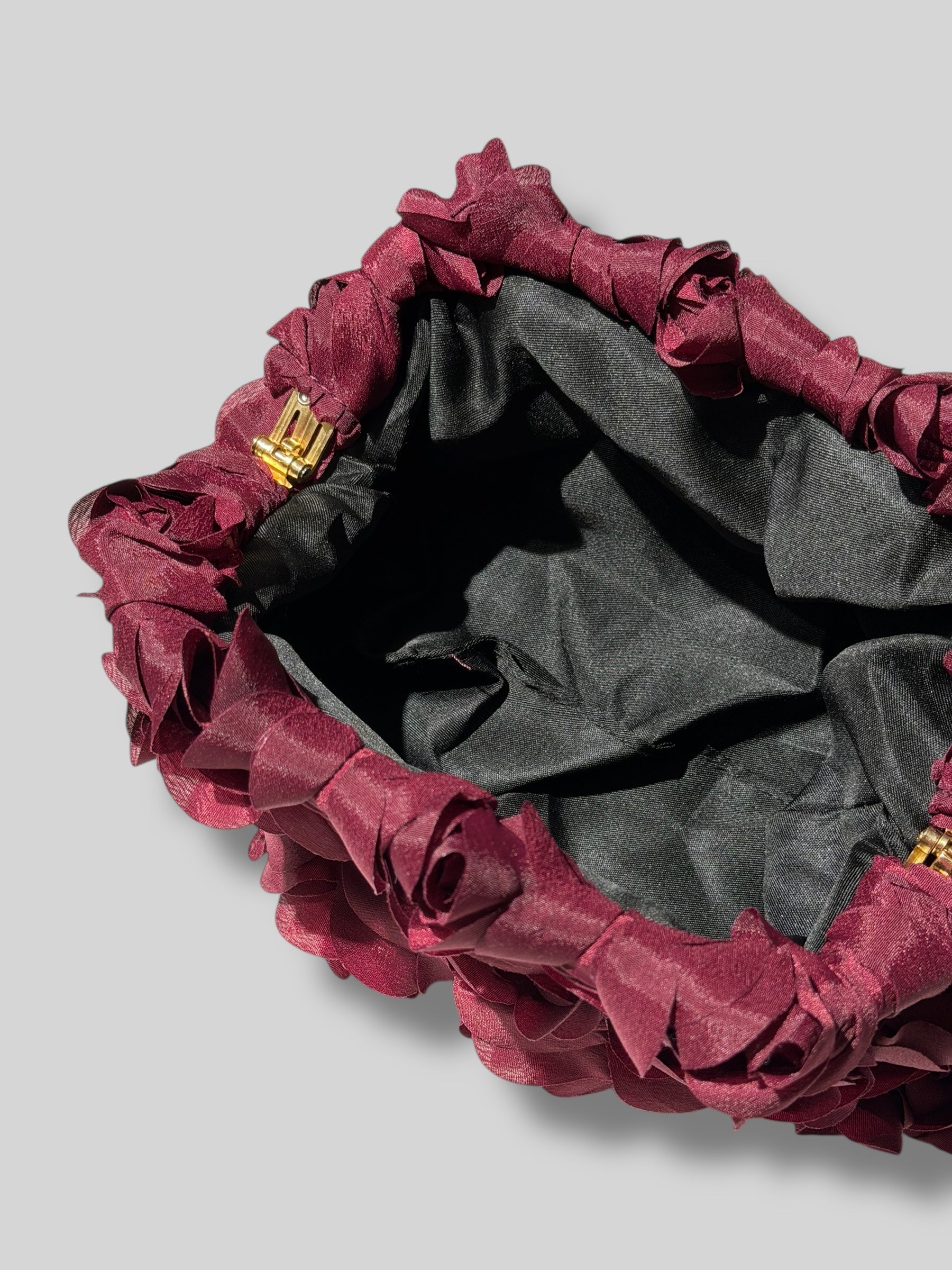 Este bolso de mano no es solo un accesorio, es una declaración de estilo. Recubierto por una densa cascada de rosas de satén hechas a mano, este clutch aporta una textura tridimensional única y un aire romántico inigualable.