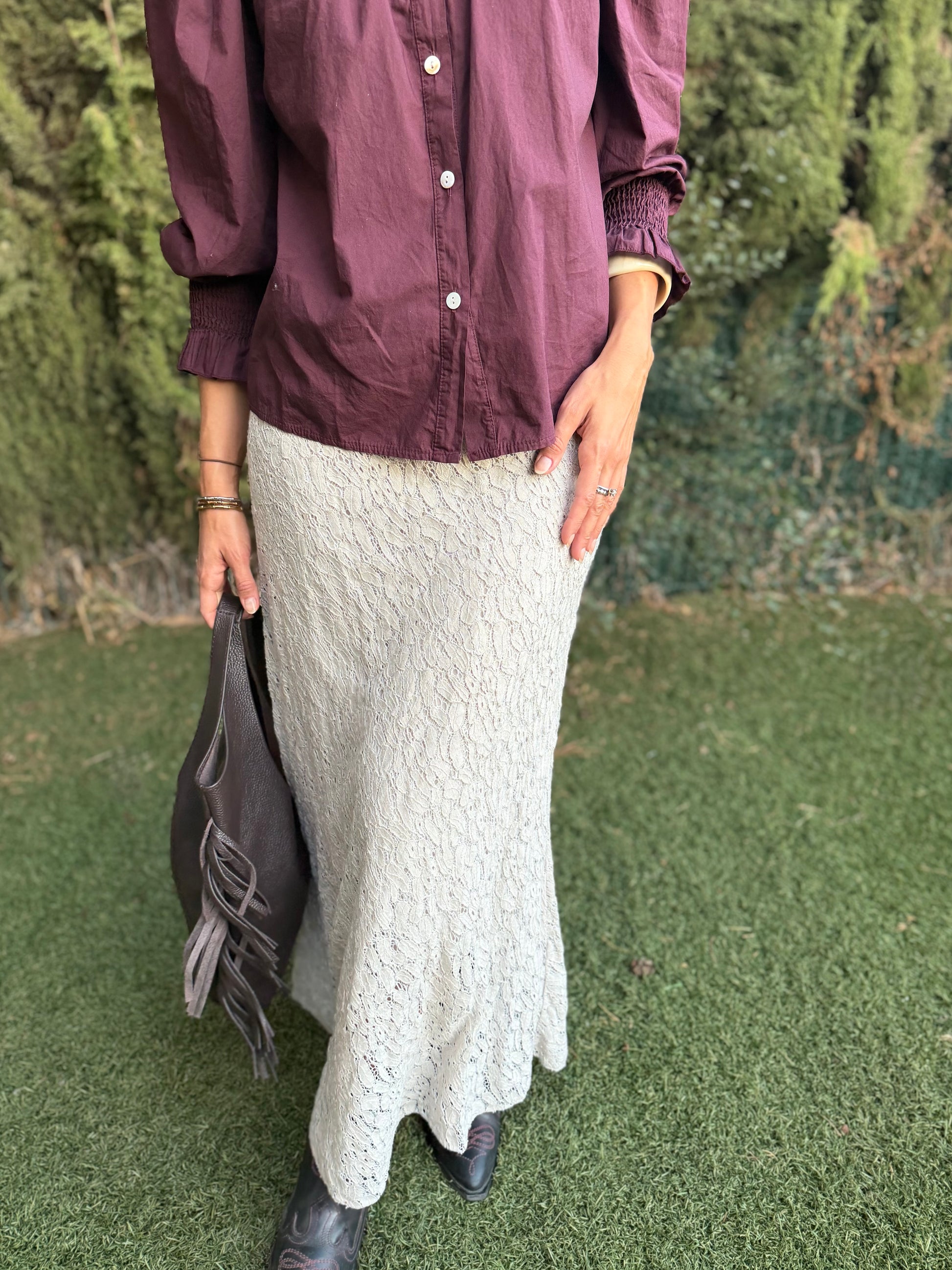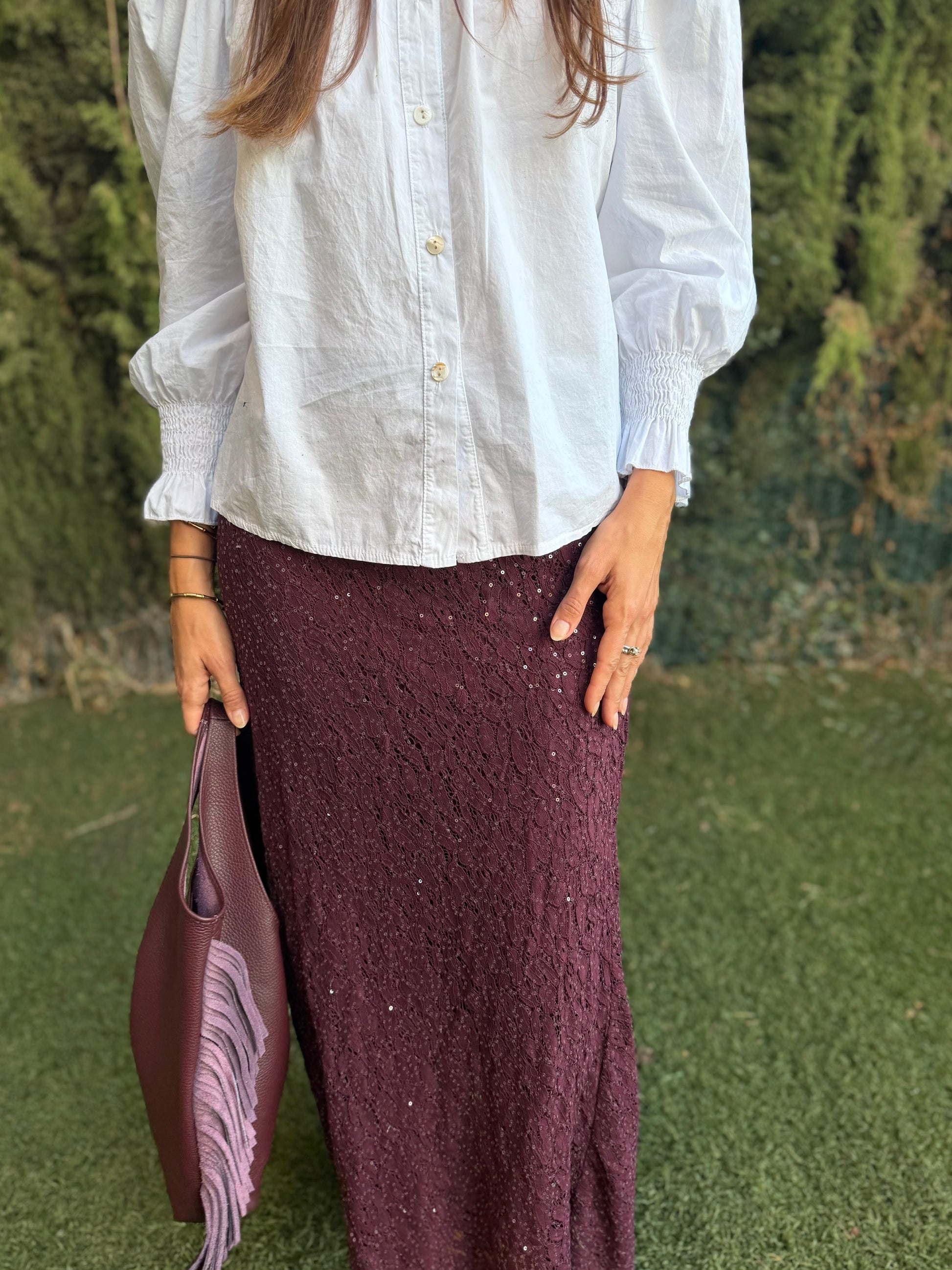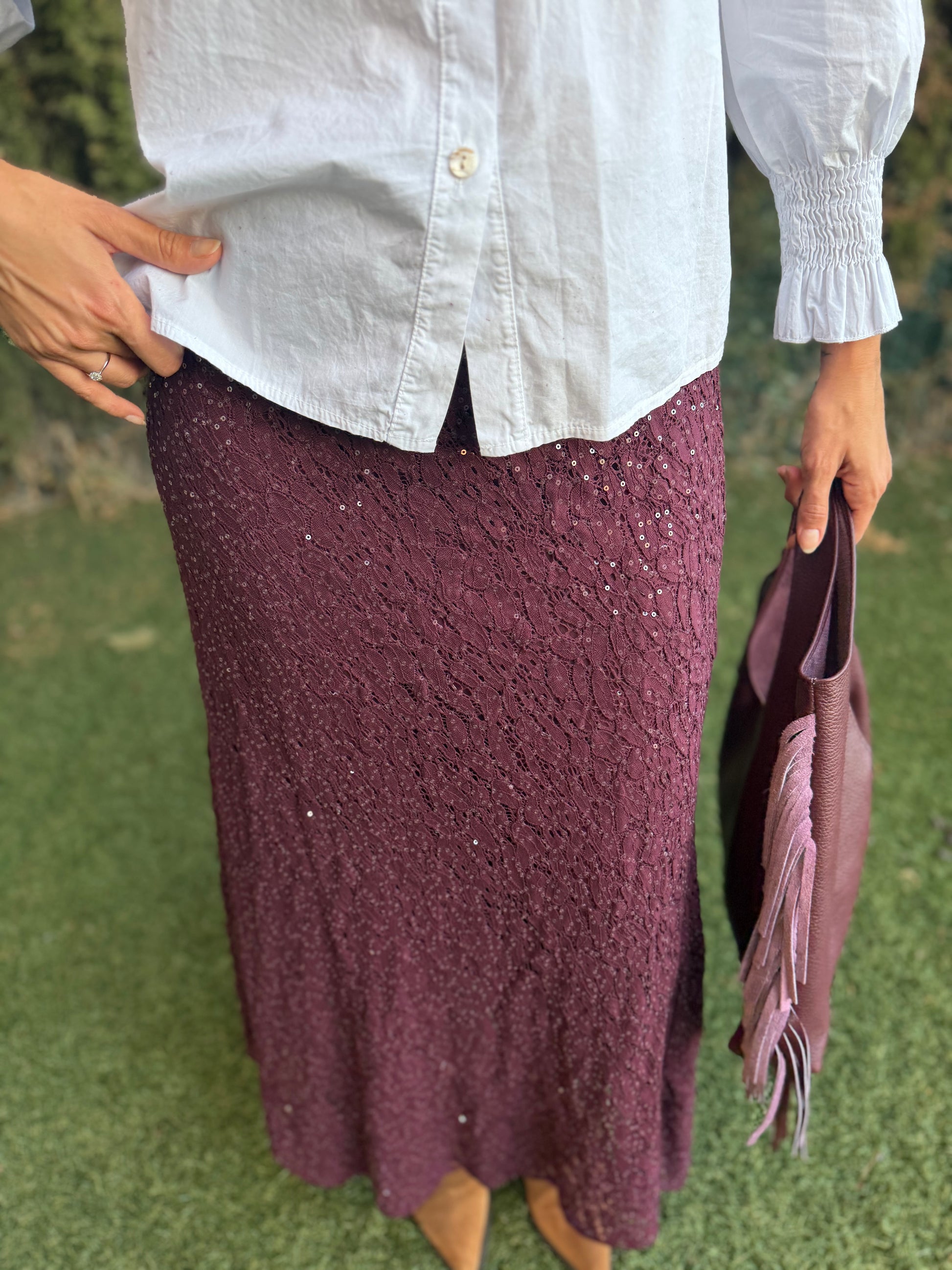 Nuestra falda larga de encaje con lentejuelas sutiles es la combinación perfecta entre delicadeza y elegancia.