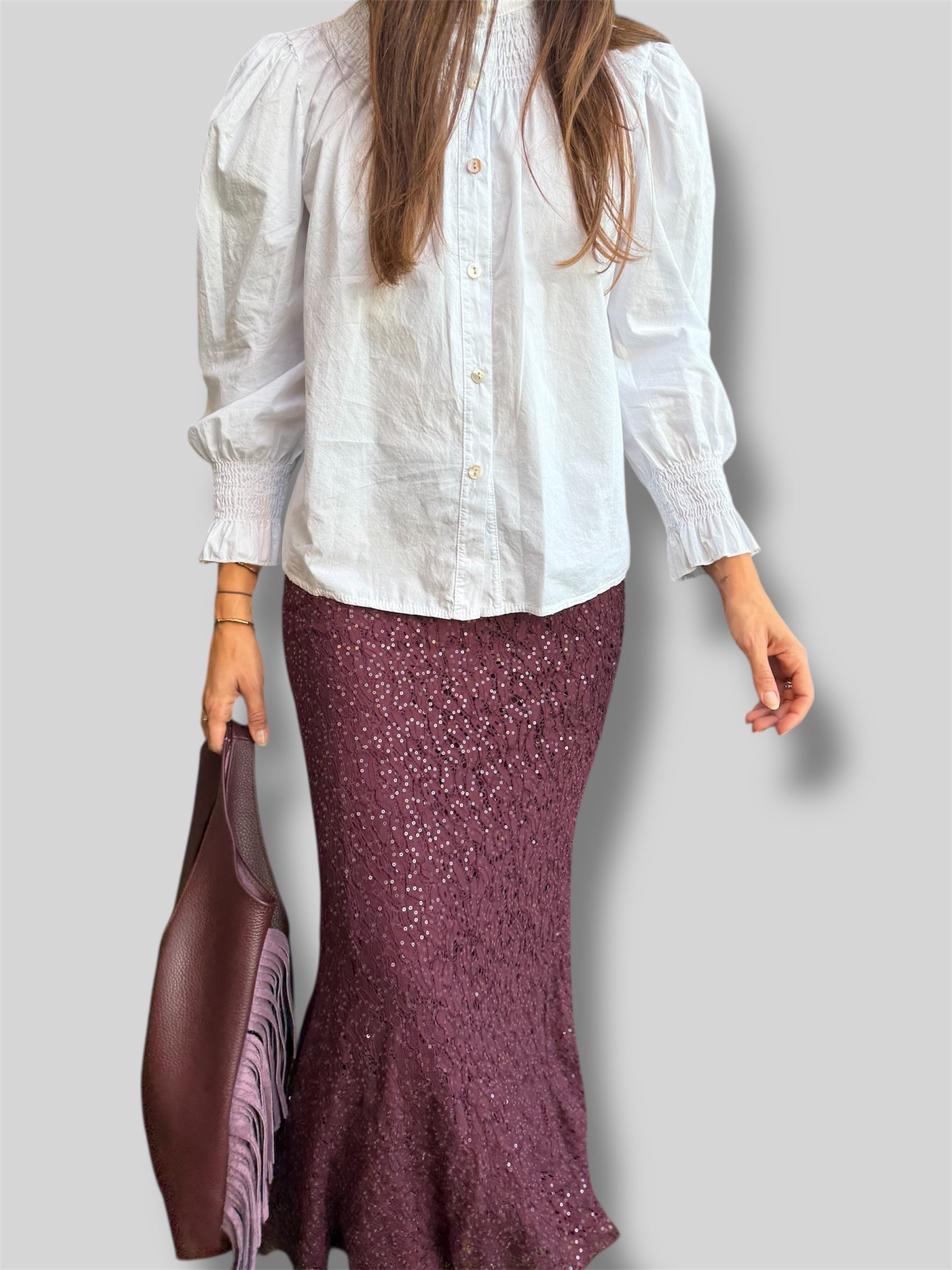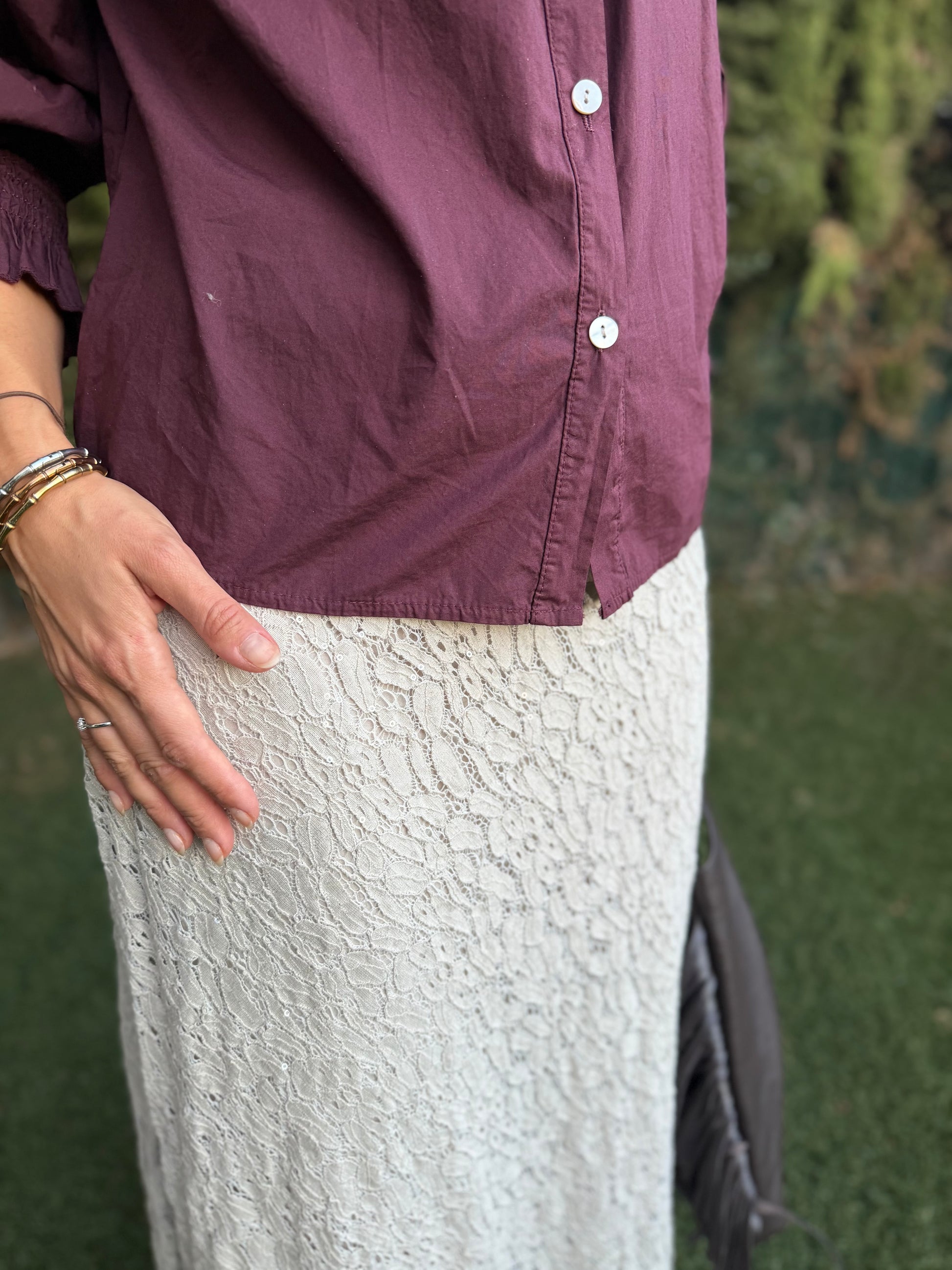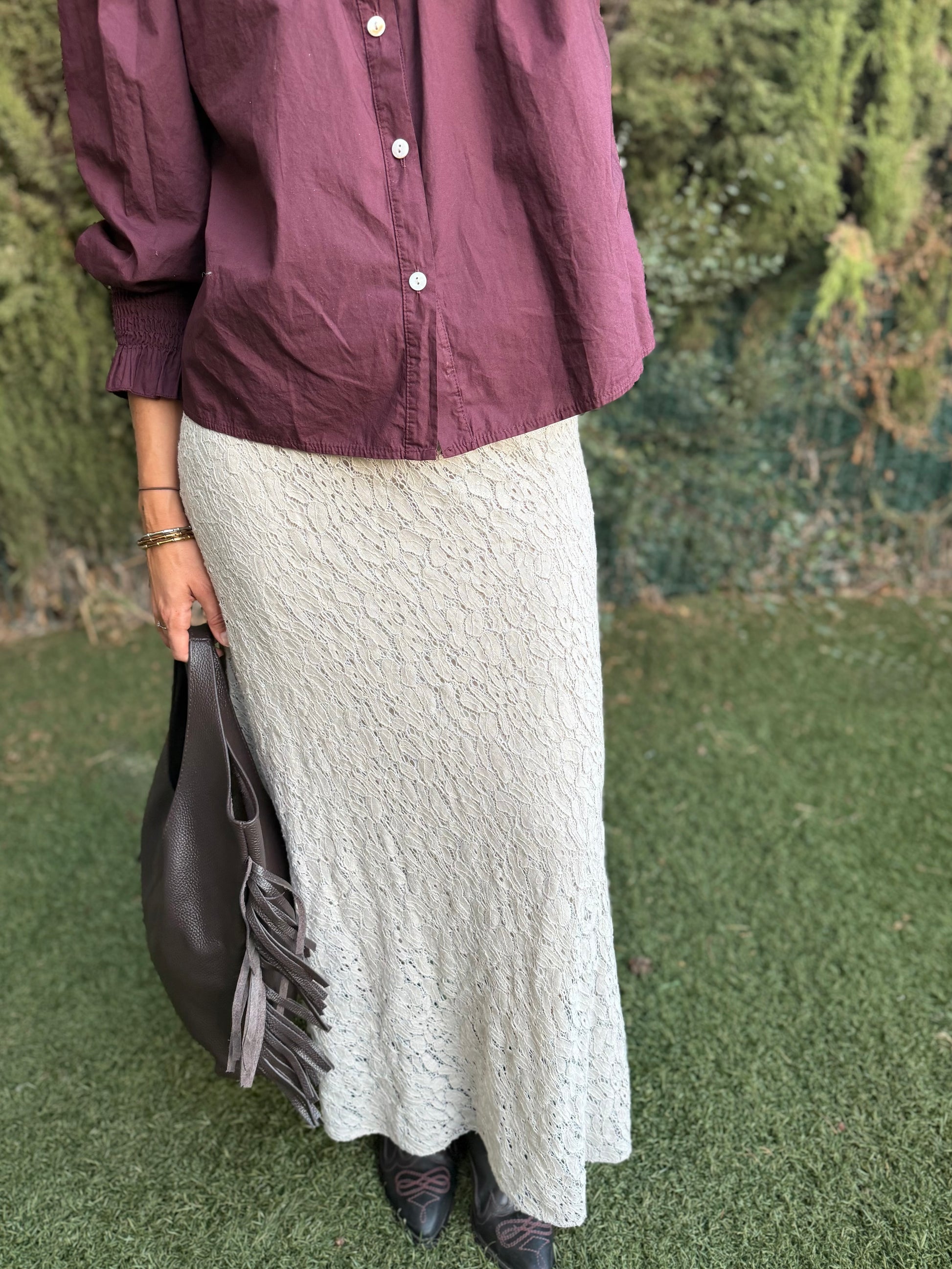 Nuestra falda larga de encaje con lentejuelas sutiles es la combinación perfecta entre delicadeza y elegancia.