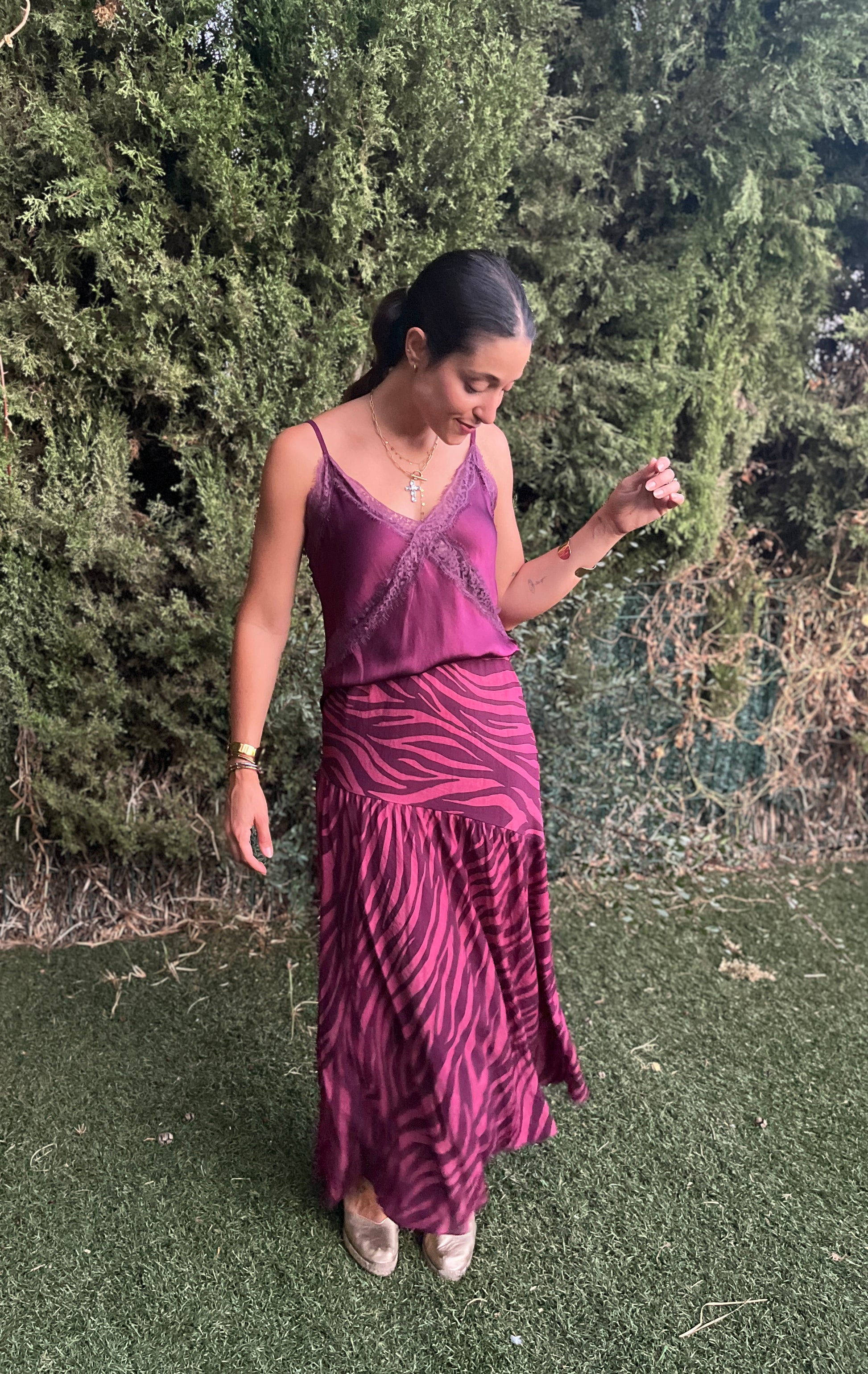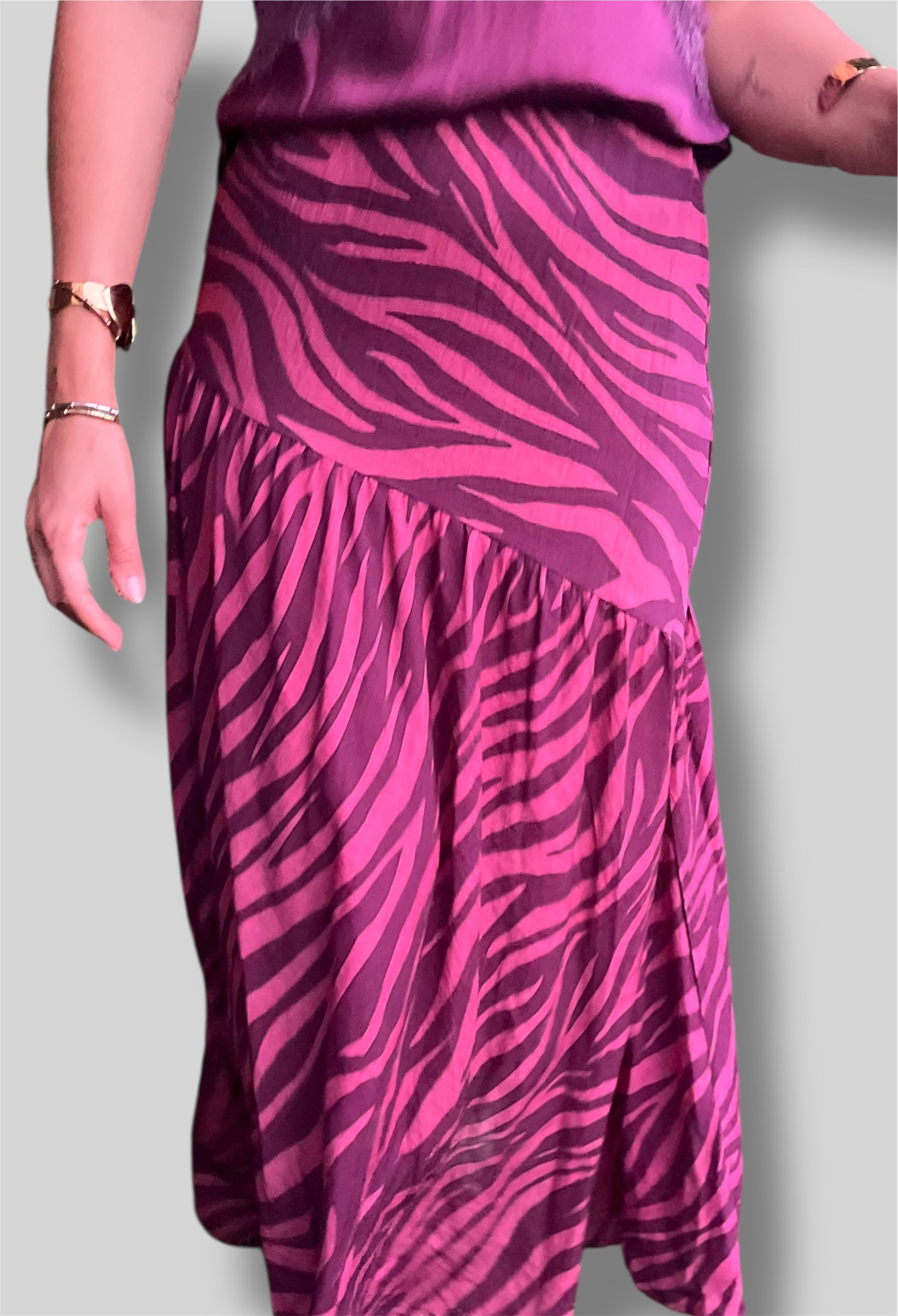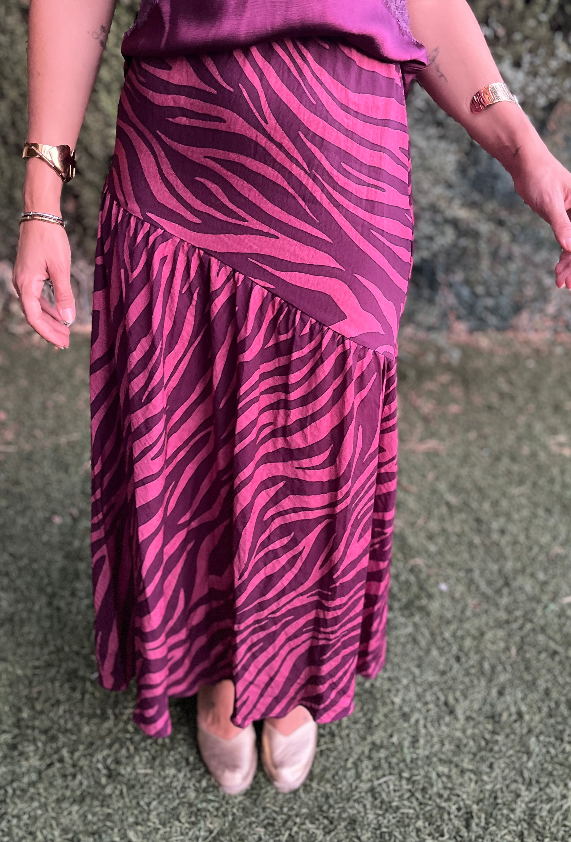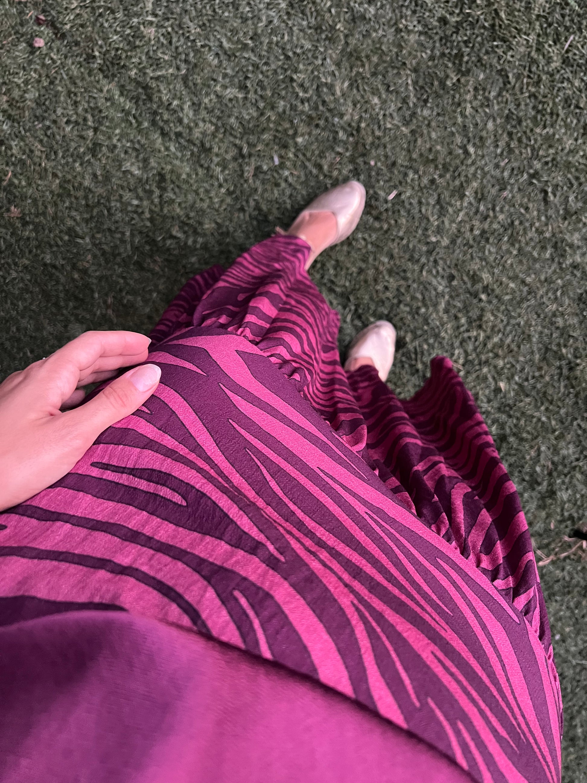 Atrévete con el animal print más vibrante de la temporada. Esta falda midi con estampado de cebra en tonos fucsia y morado es perfecta para destacar en cualquier ocasión. Su diseño fluido y ligero aporta movimiento y comodidad, mientras que el corte en diagonal en la cadera estiliza la figura y le da un toque original.