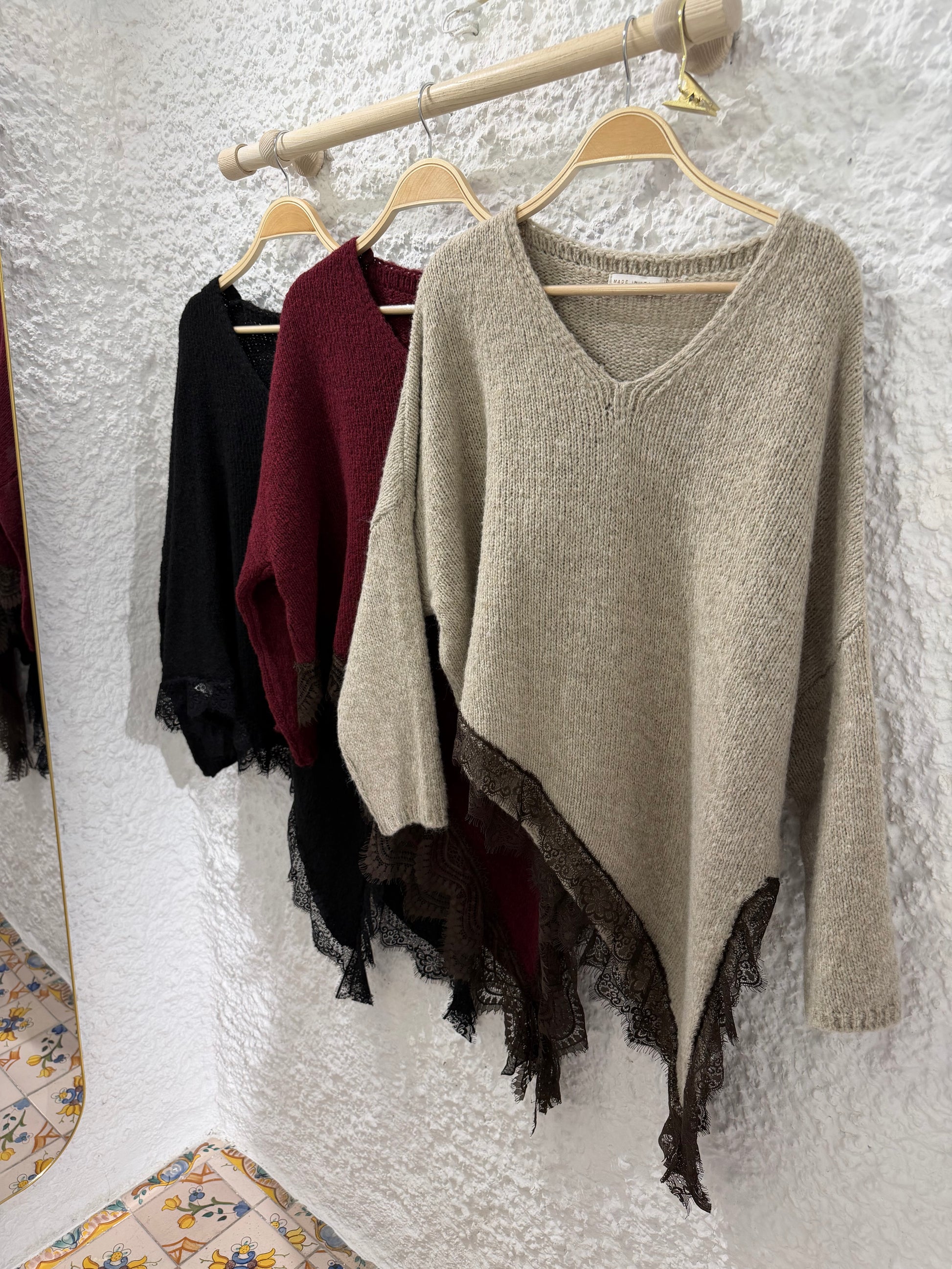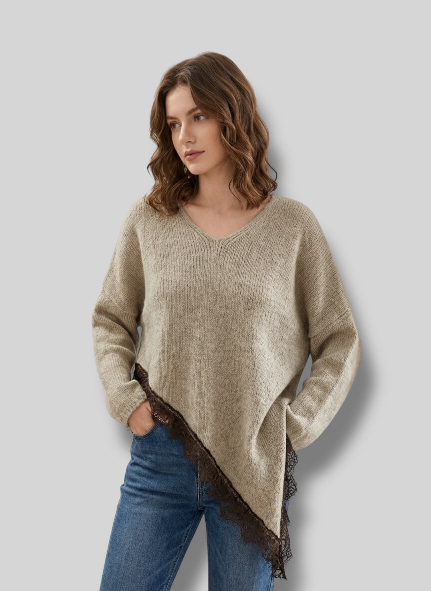 El acabado con un delicado encaje semitransparente en el borde transforma este jersey en una pieza única, ideal para quienes buscan diferenciar su estilo.