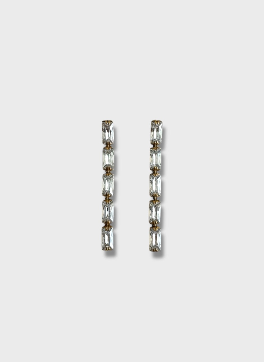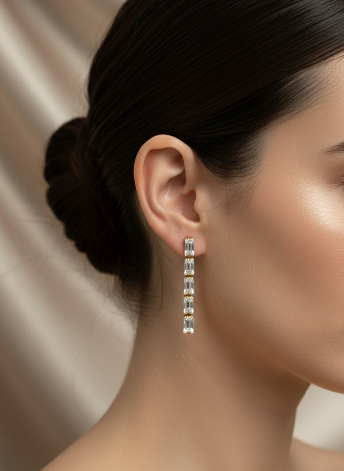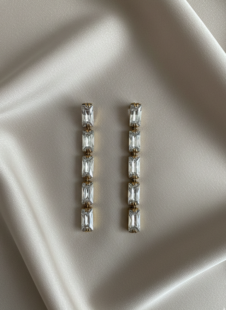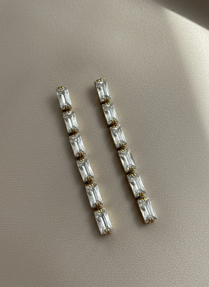 Estos sofisticados pendientes presentan un diseño lineal y minimalista, compuesto por una cascada vertical de cinco cristales de talla rectangular (baguette). Cada cristal está meticulosamente engastado sobre una base de acero inoxidable con acabado en oro, lo que garantiza una durabilidad excepcional, resistencia al desgaste y un brillo atemporal.
