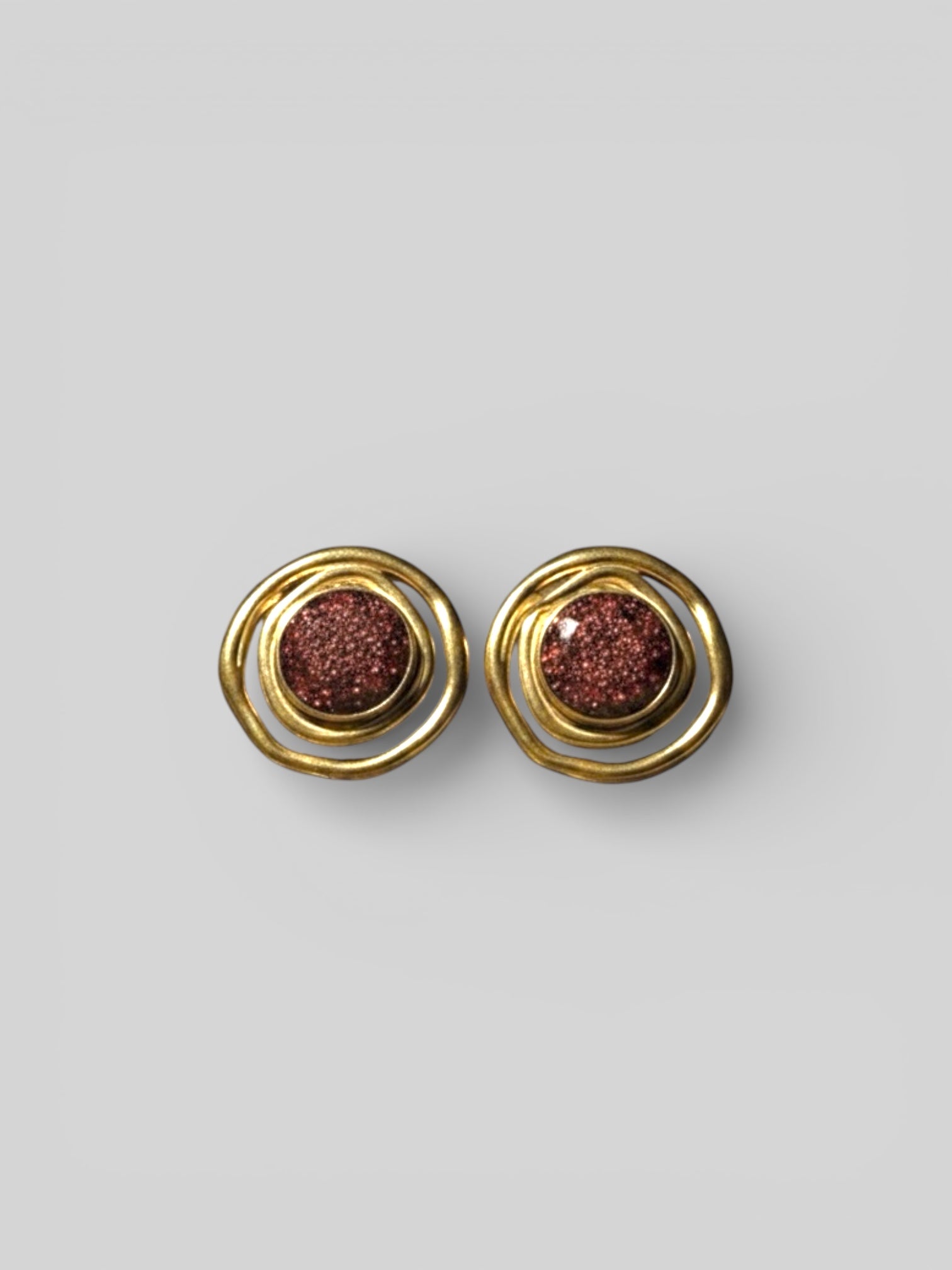 • Centro de Textura: En el corazón de la espiral se encuentra un cabujón circular con una textura granulada y profunda. El color es un granate intenso o borgoña con sutiles destellos metálicos, simulando la apariencia de una geoda natural o arena volcánica cristalizada.