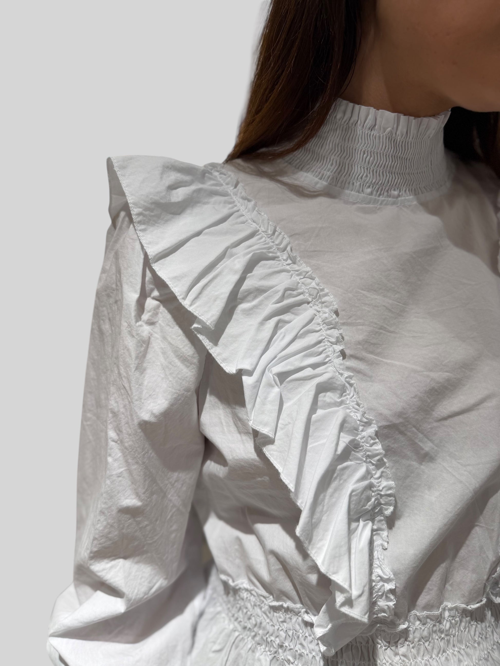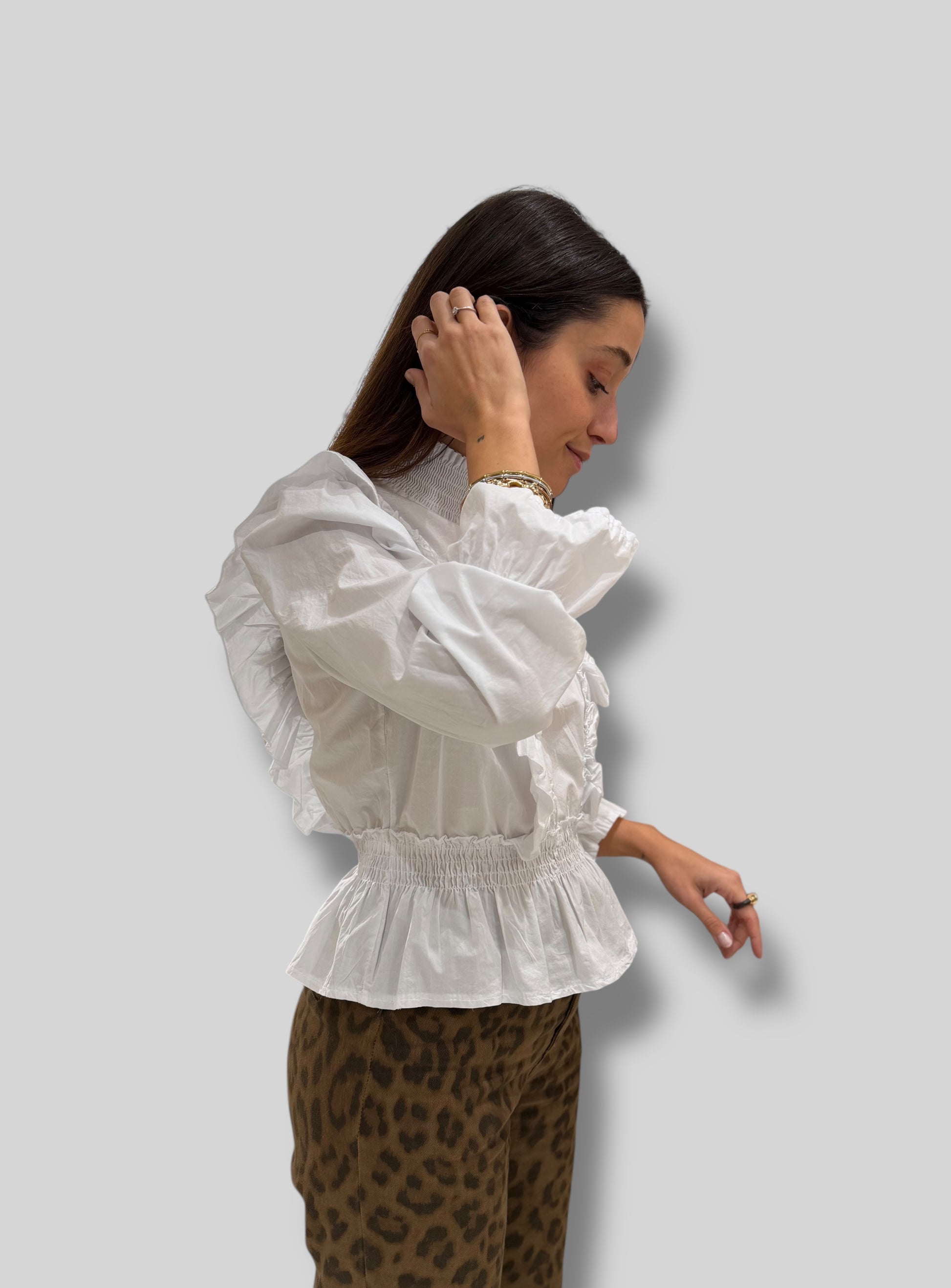 Camisa blanca de estilo romántico y femenino, diseñada para elevar cualquier look. Destaca por sus volantes en los hombros que caen suavemente hasta la cintura, aportando movimiento y un toque especial. El cuello levantado le da un aire sofisticado, mientras que la manga francesa la hace ideal tanto para entretiempo como para ocasiones más arregladas.