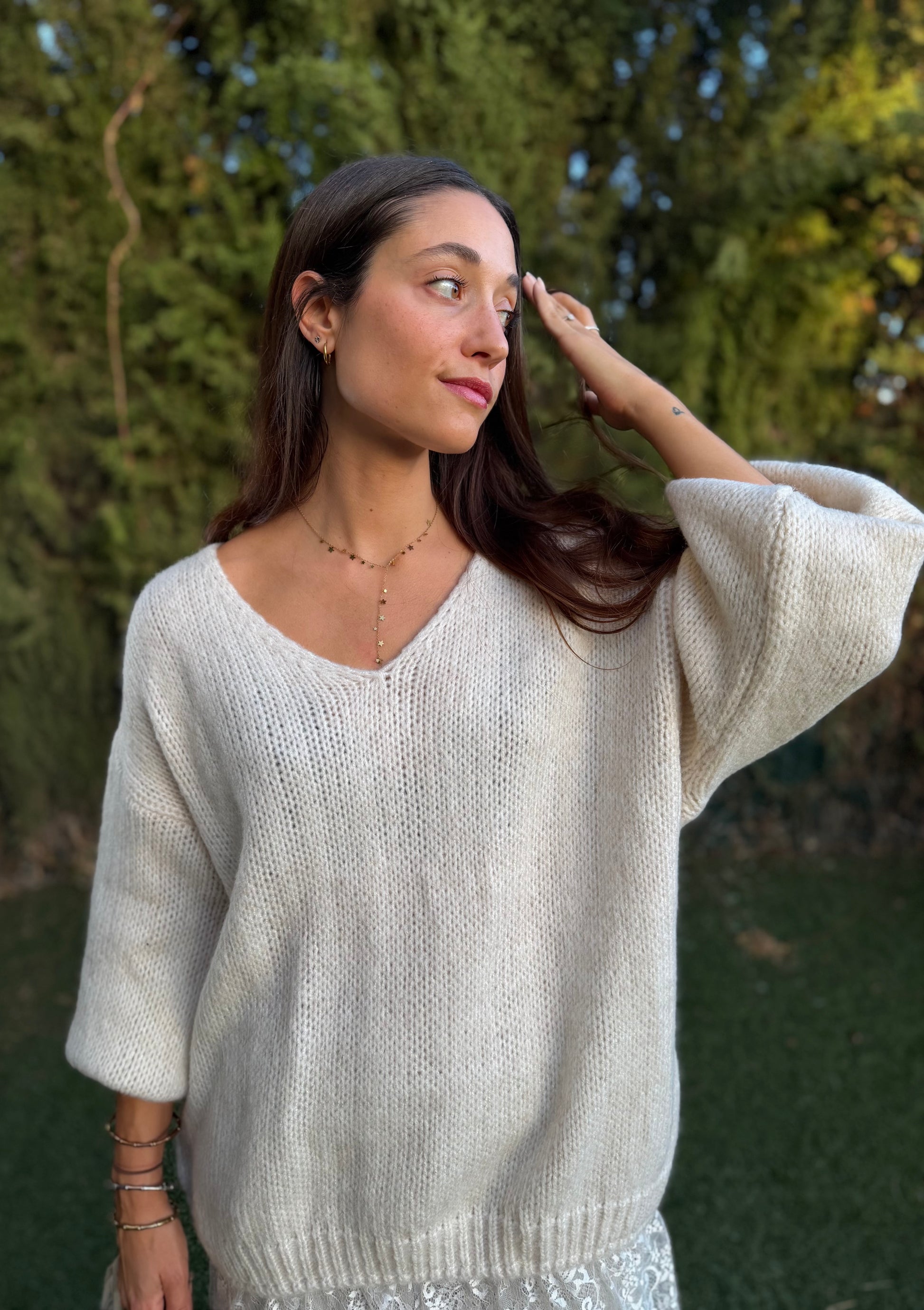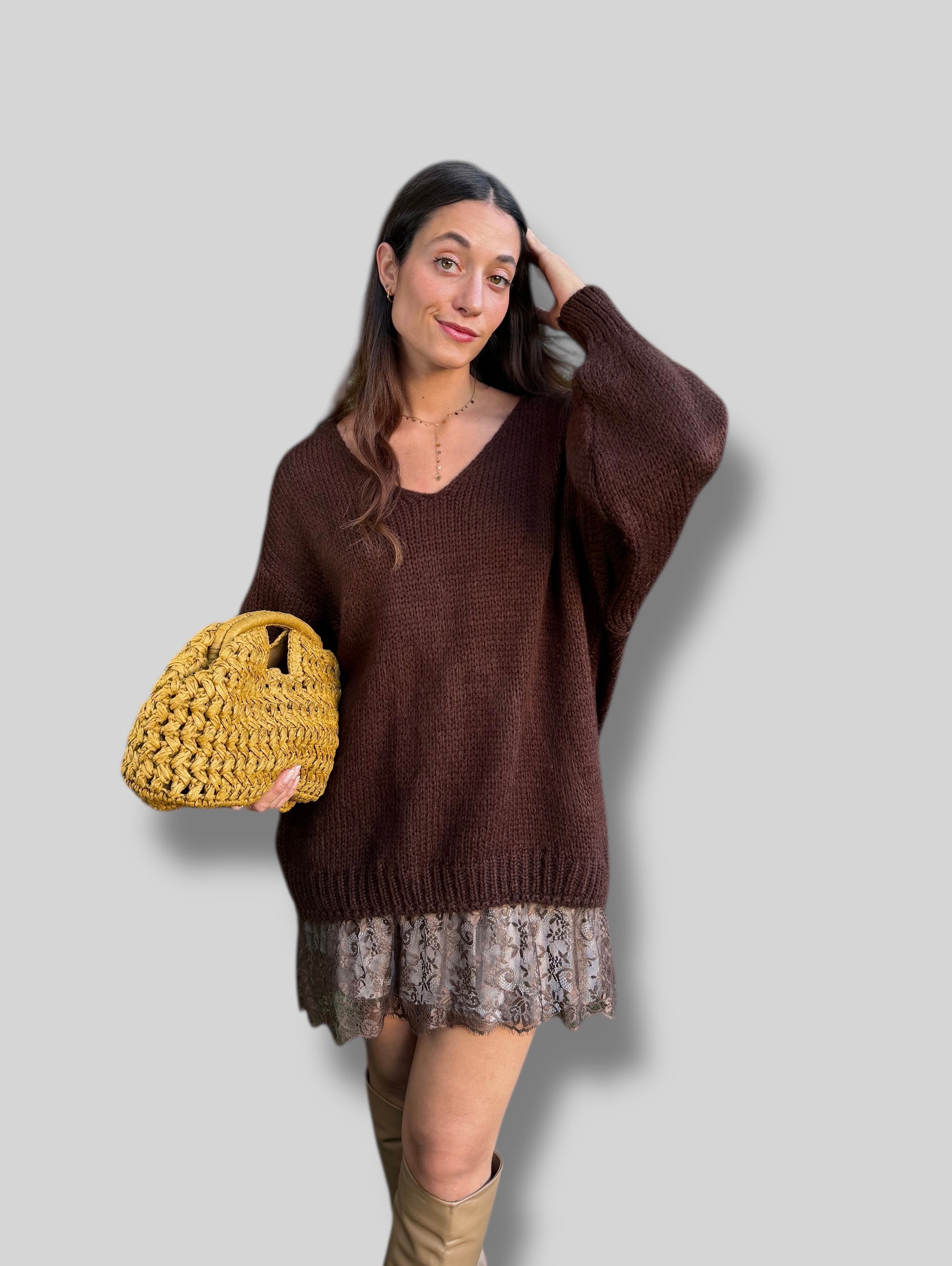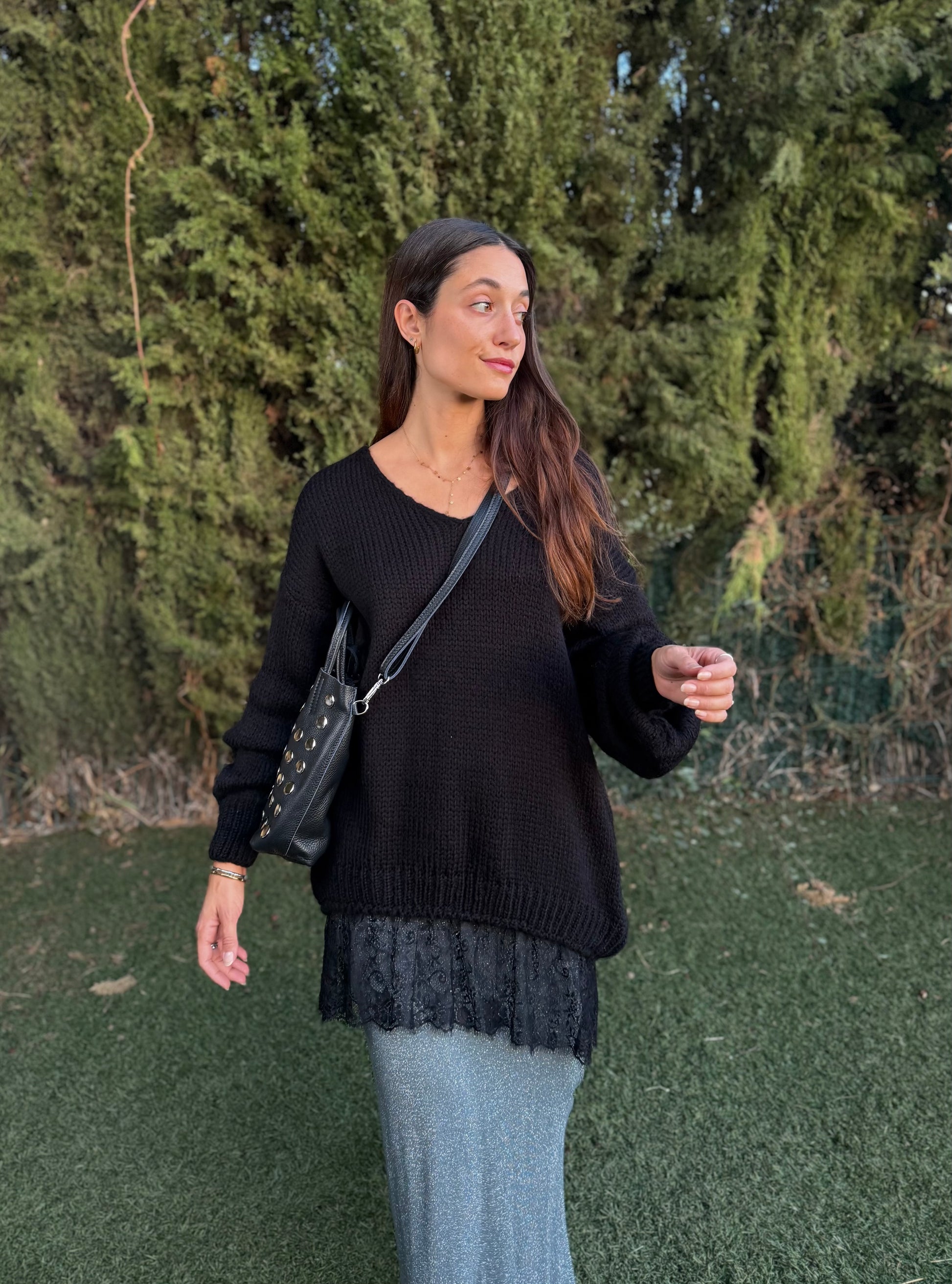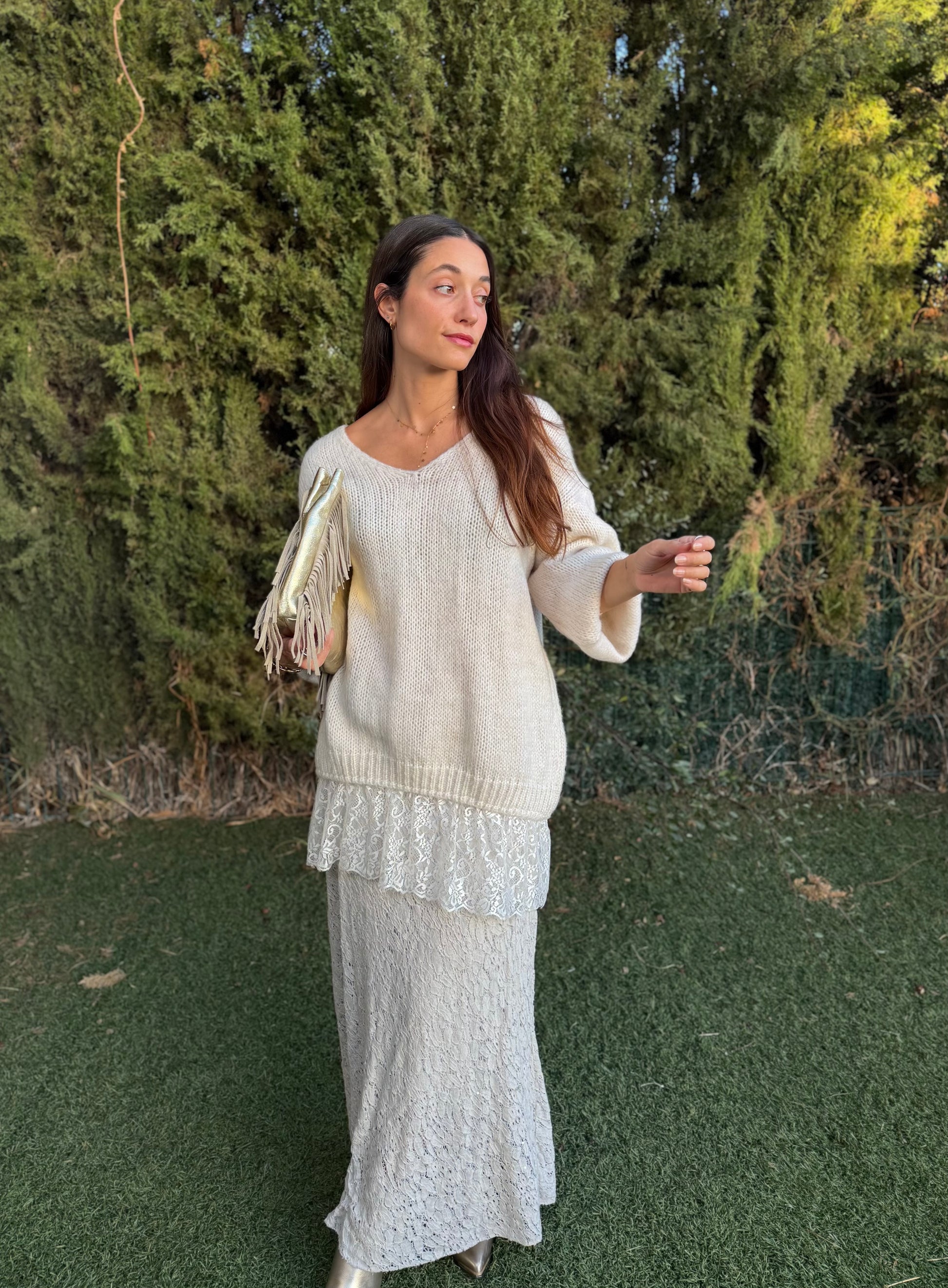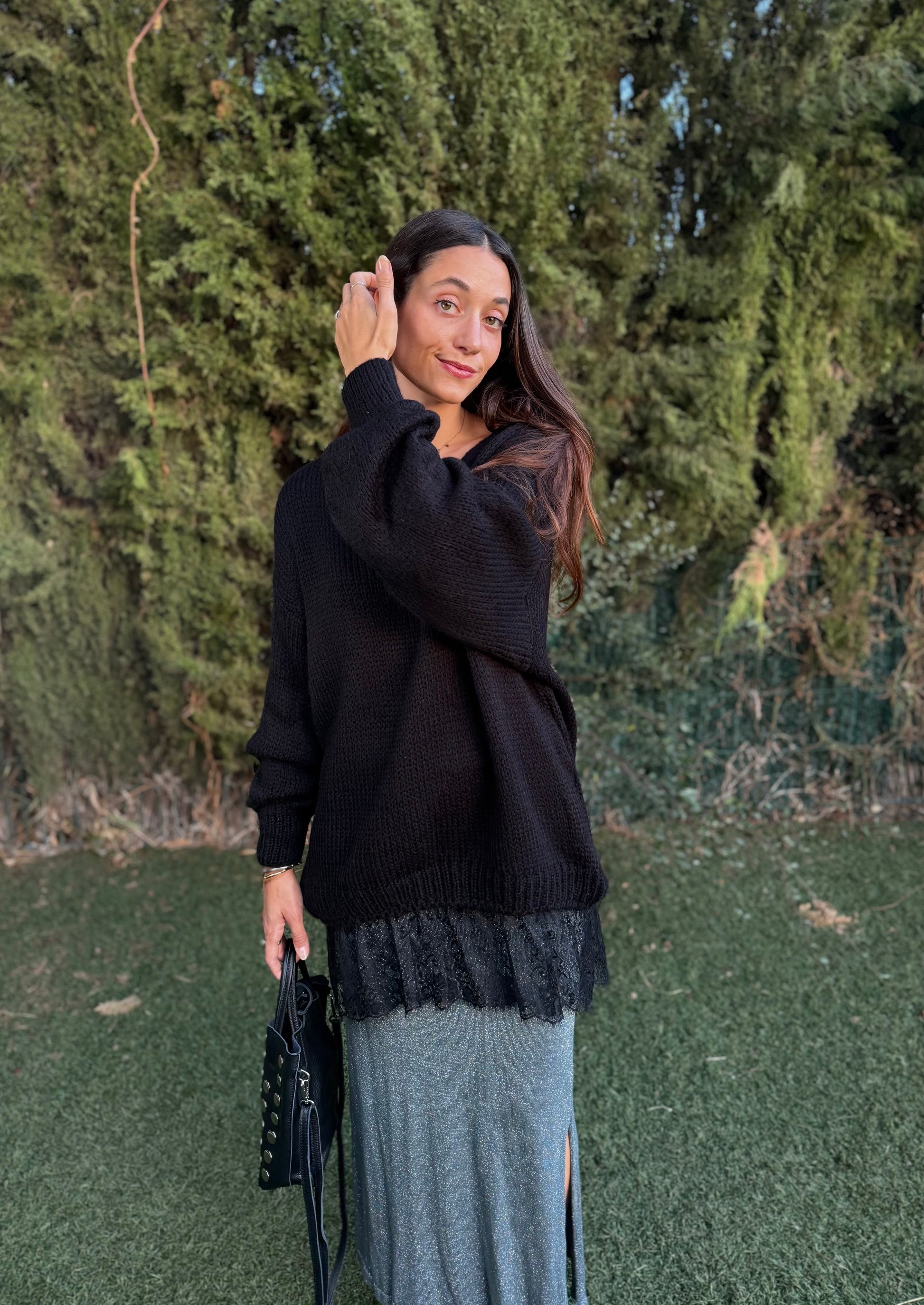 Este jersey de punto presenta un diseño holgado con detalle de encaje en el bajo, perfecto para combinar con faldas, pantalones o vestidos.