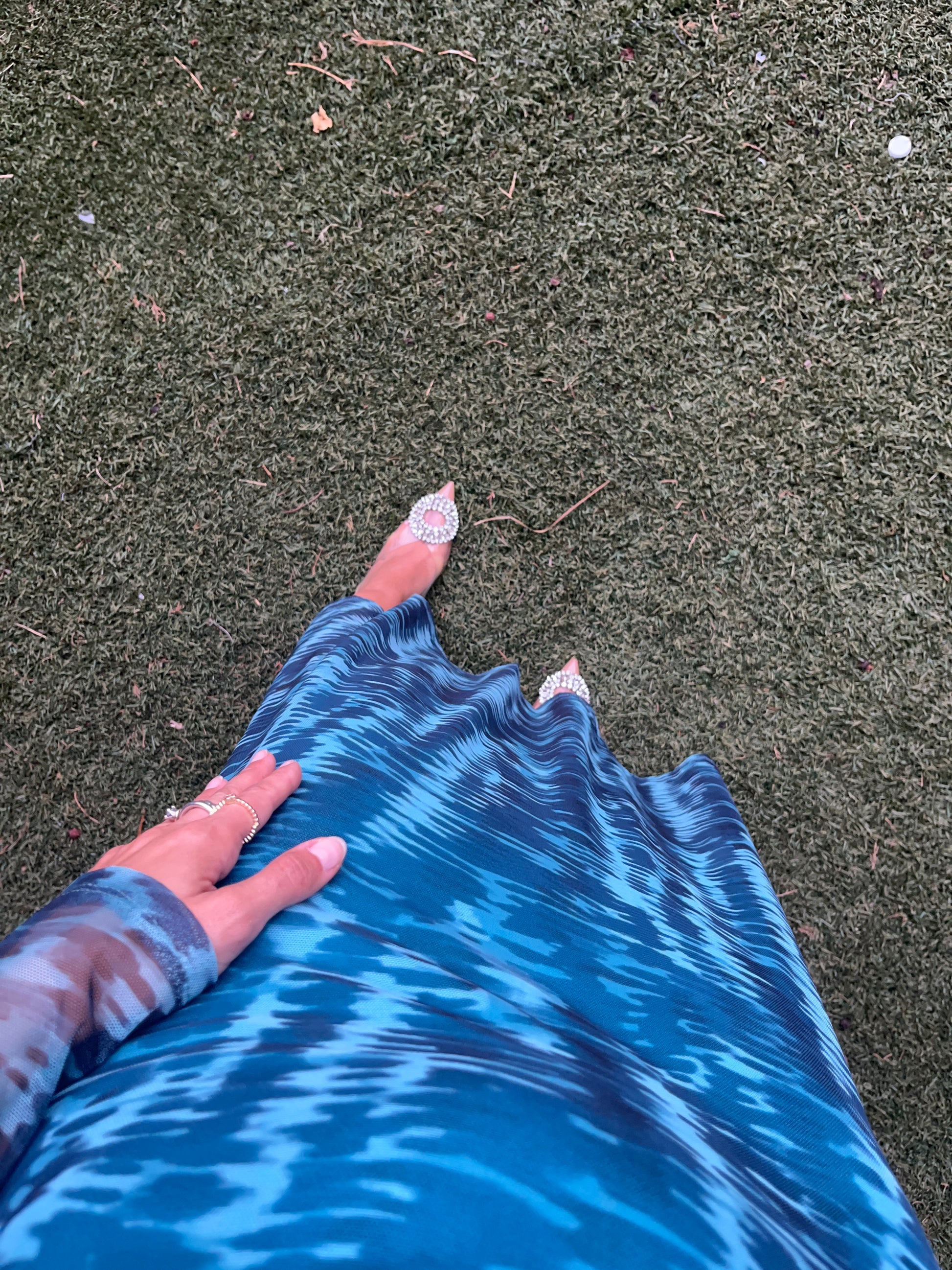 Elegante, fluido y con un toque atrevido, este vestido combina una silueta ajustada con tejido semitransparente y un estampado azul efecto agua que lo hace único.