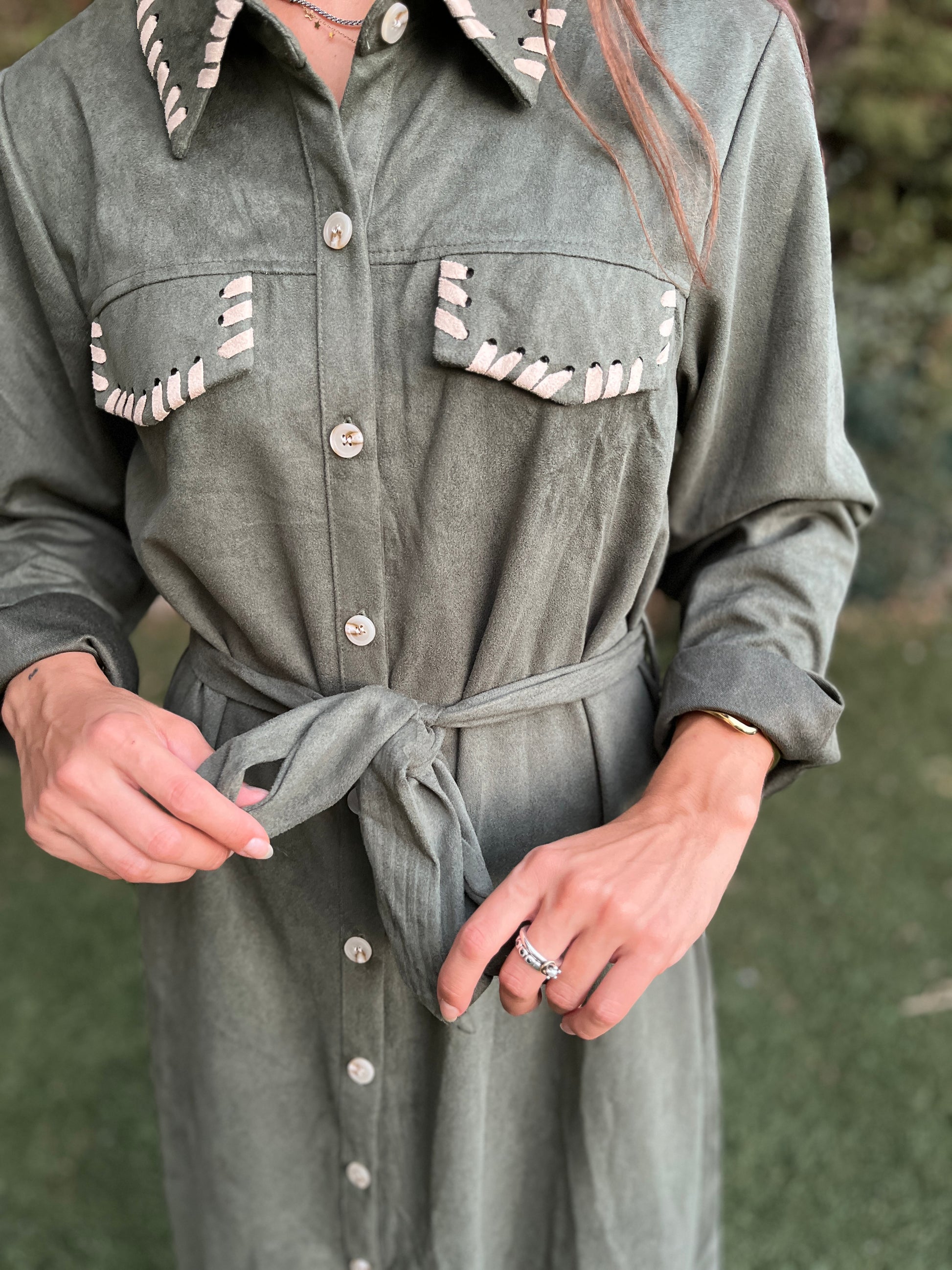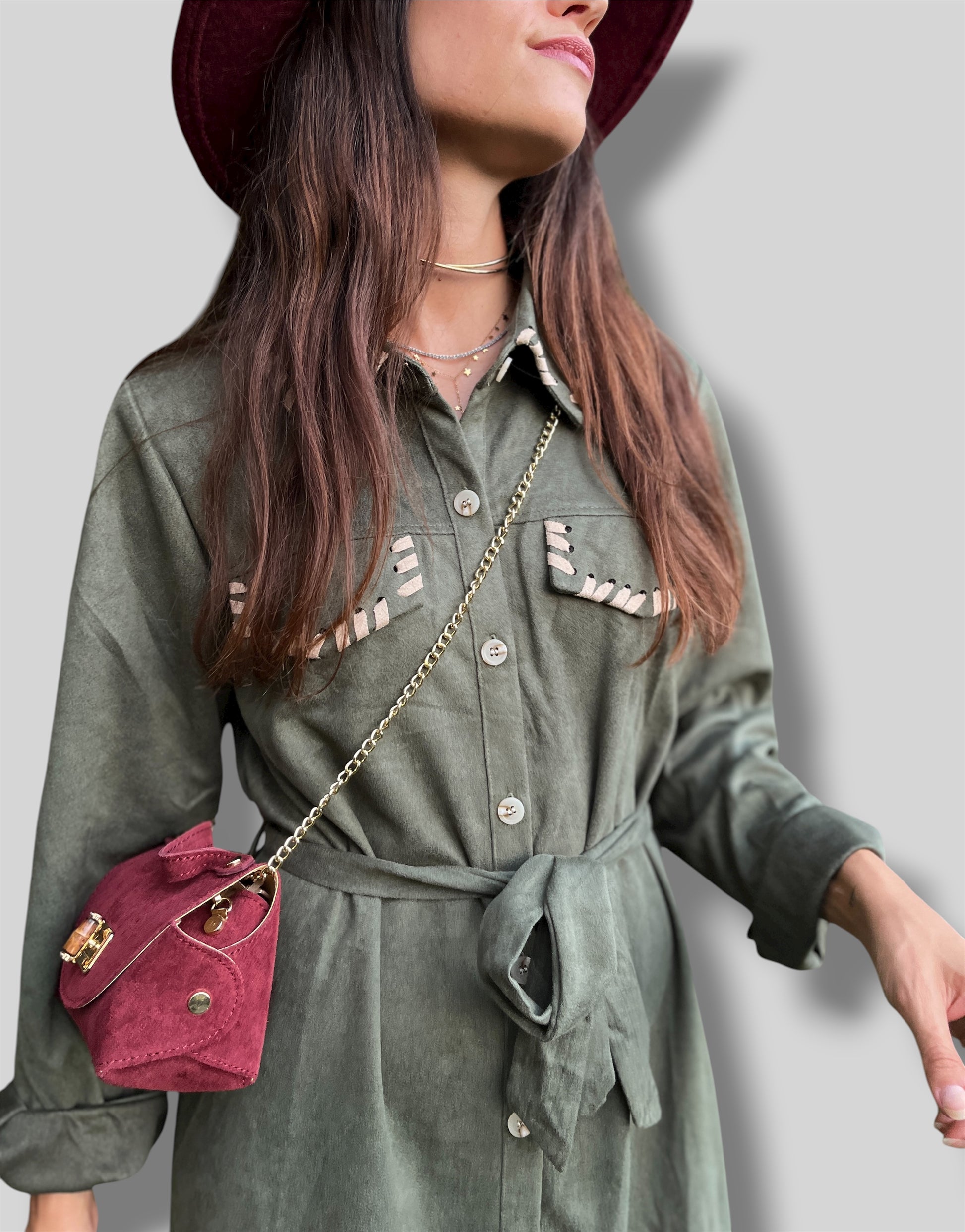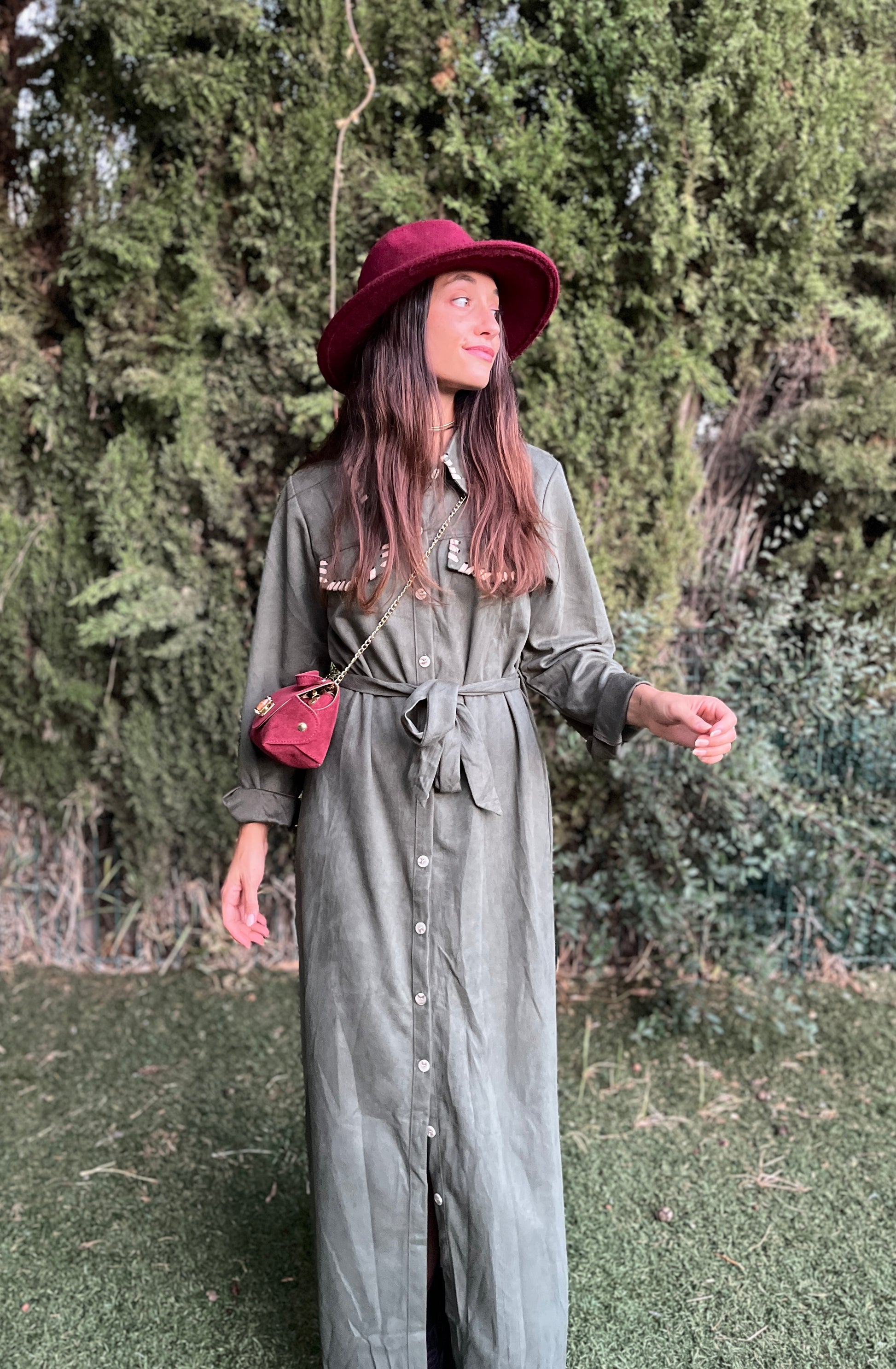 Elegancia y comodidad se unen en este vestido largo de ante en color caqui. Su diseño fluido realza la silueta, mientras que la cuerda en la cintura permite ajustarlo a la medida que quieras aportando un toque femenino y versátil.