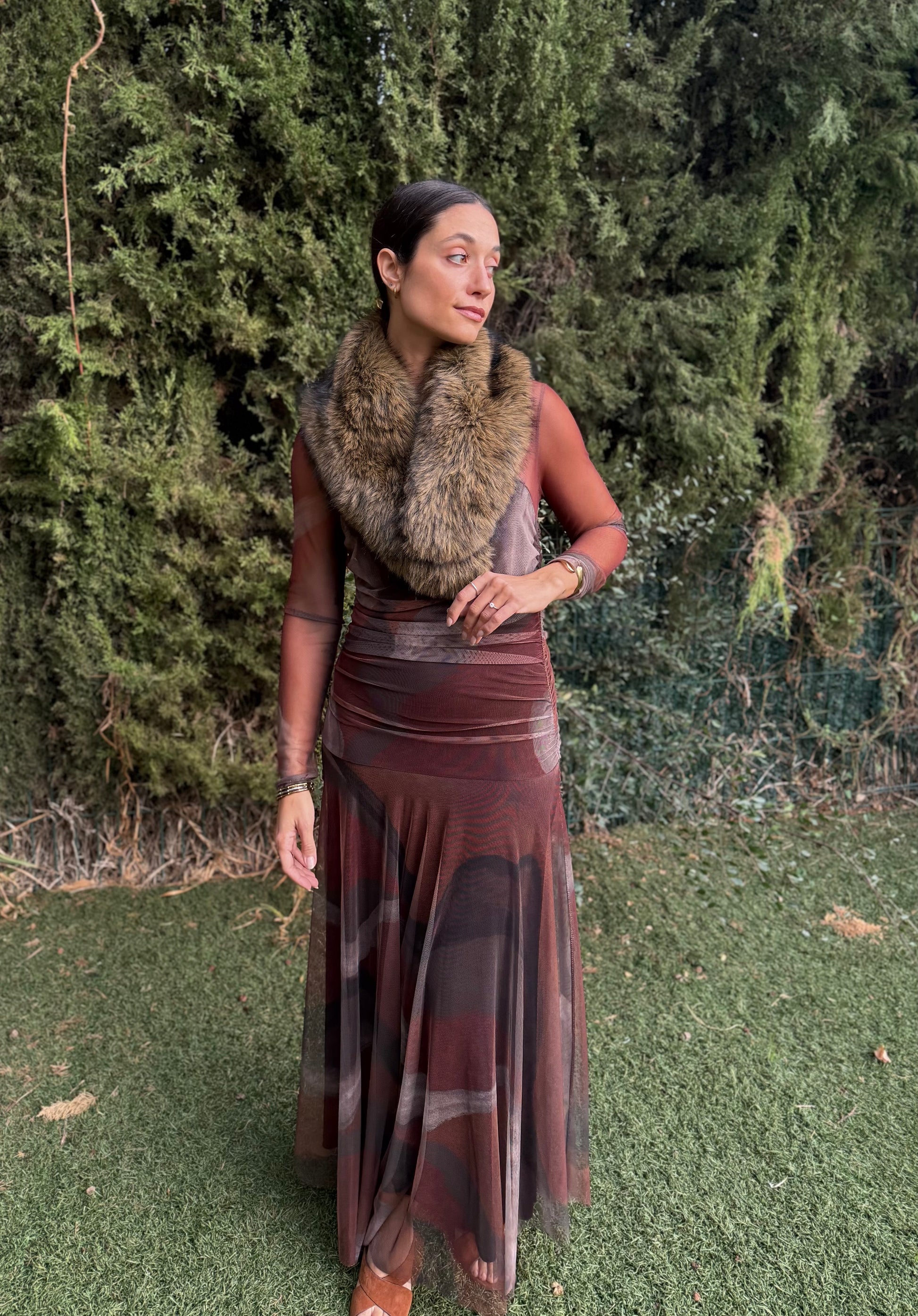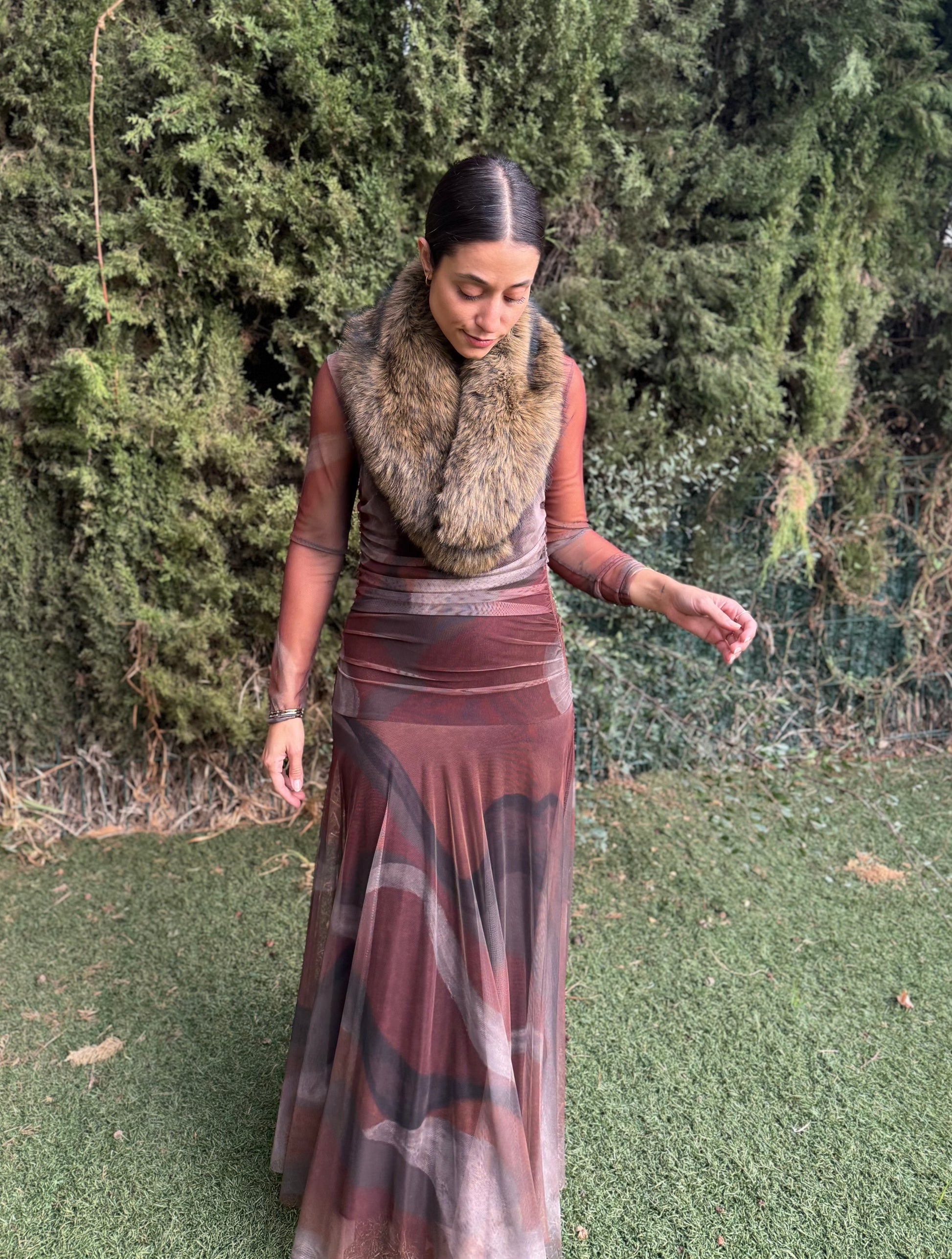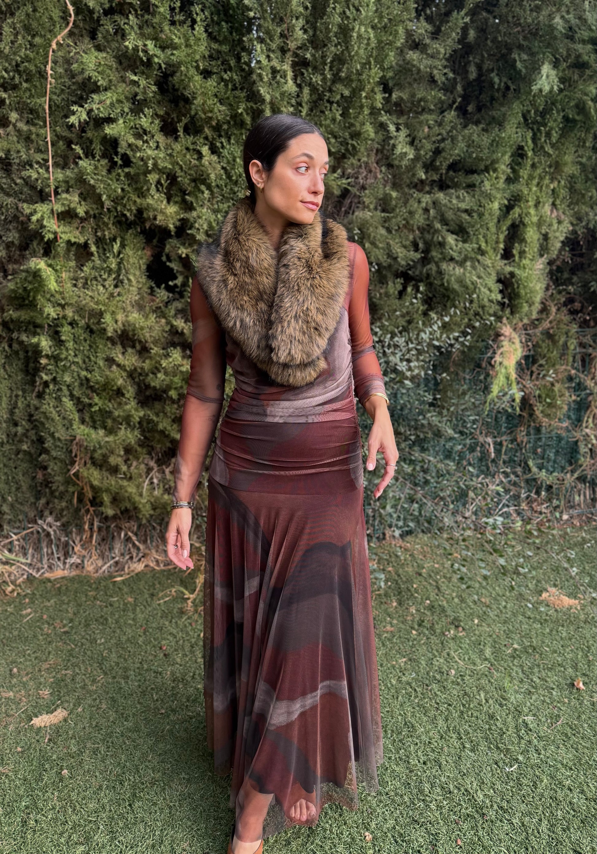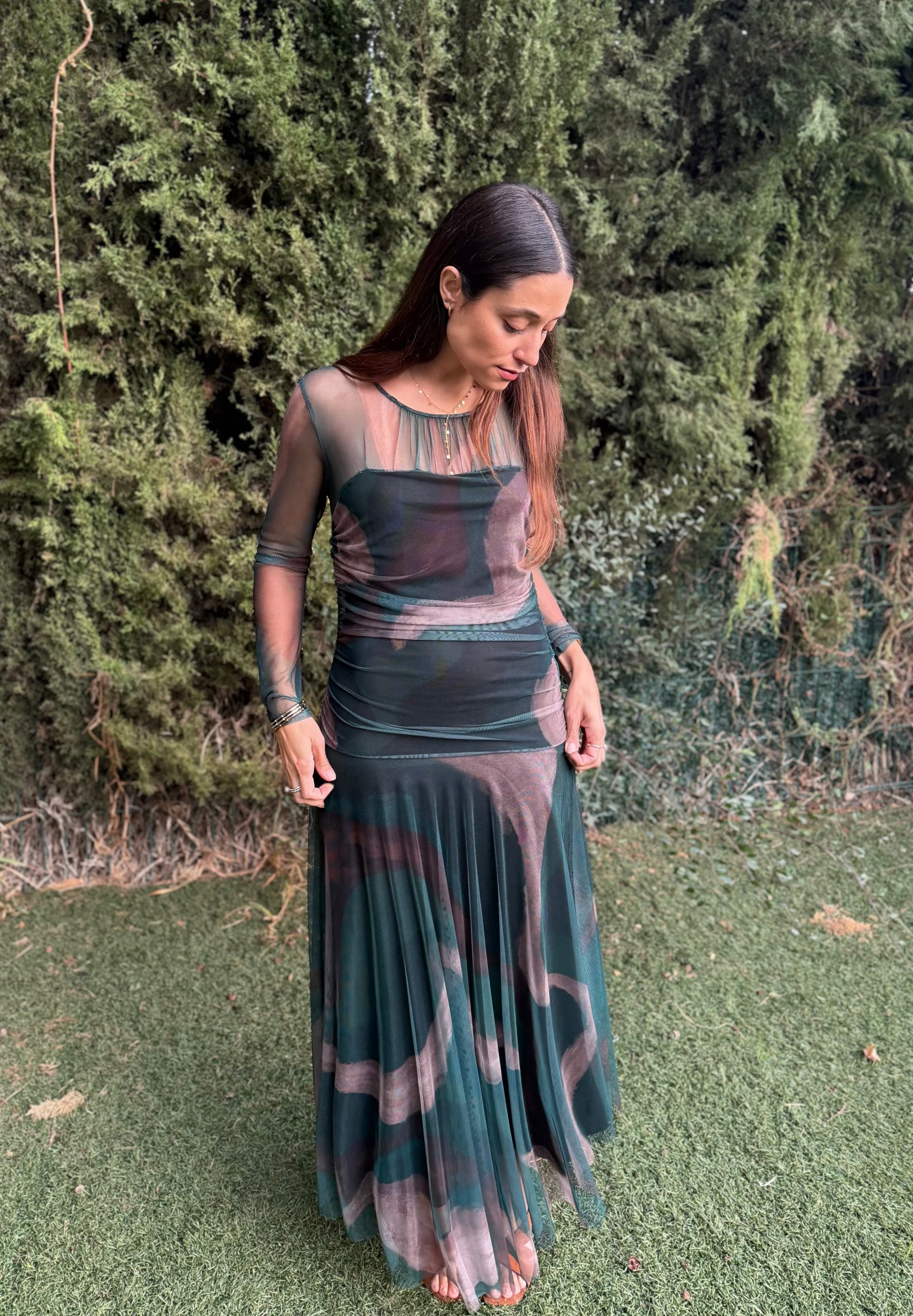 Déjate envolver por la caída fluida y el movimiento único de este vestido largo de tul. Su tejido semitransparente crea un efecto delicado y femenino, mientras que el forro interior ajustado y el fruncido lateral estilizan la figura sin renunciar a la comodidad.